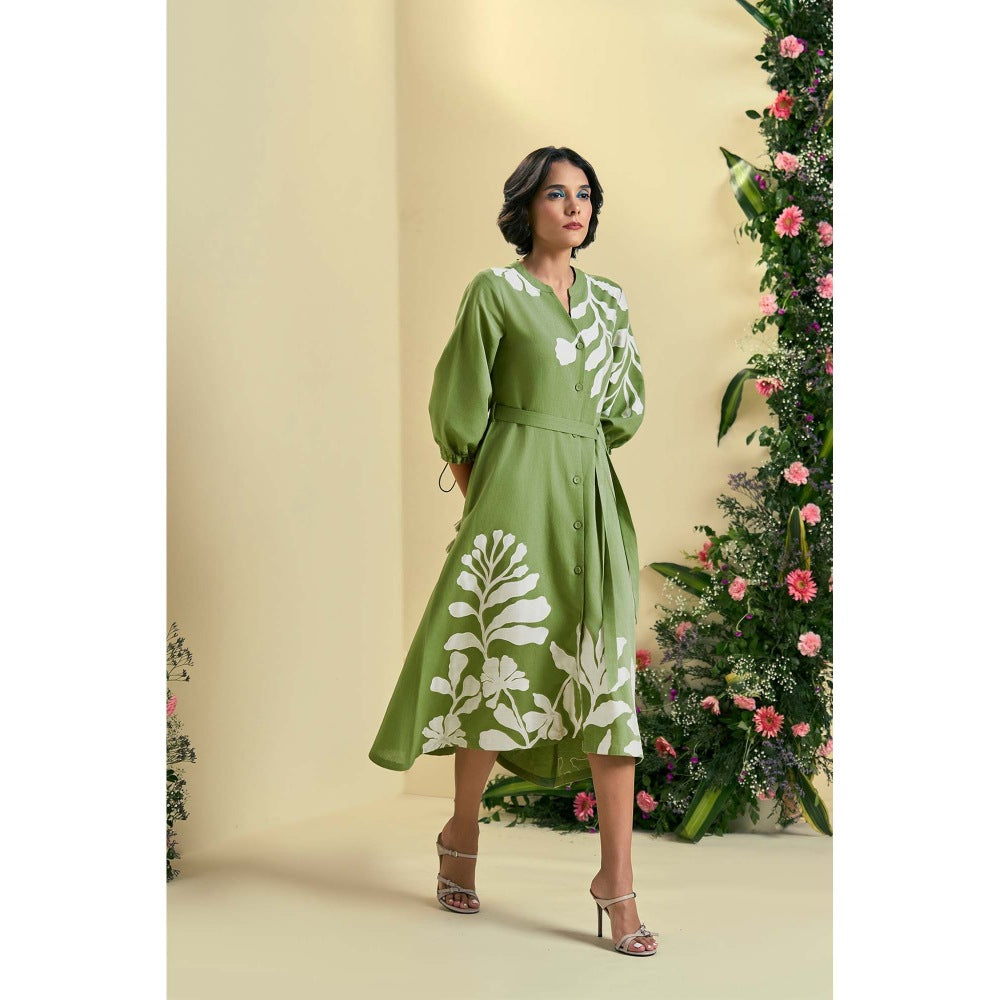 Description : Effortless and flattering, this green dress, belt from ORIGANI. Made from high quality linen blend, it features button fly closure and floral pattern along with three fourth sleeves & mandarin neck design. Pair it with heels and minimal jewellery to complete your ensemble.
