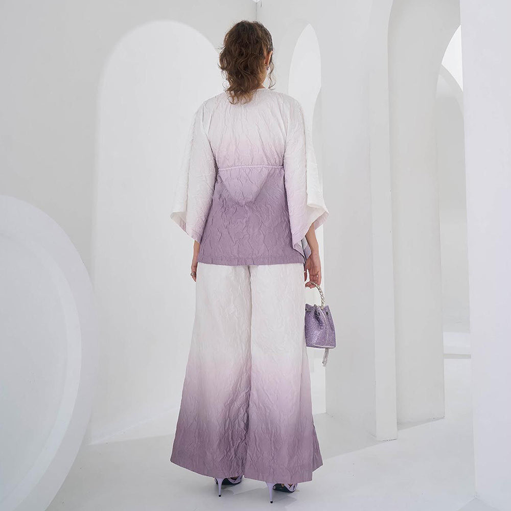 Description : Featuring A Grey Ombre Coord Set with Crushed Crepe Base. It Has A High Low Pattern. It Is Paired with Matching Pants.