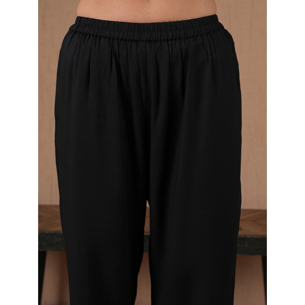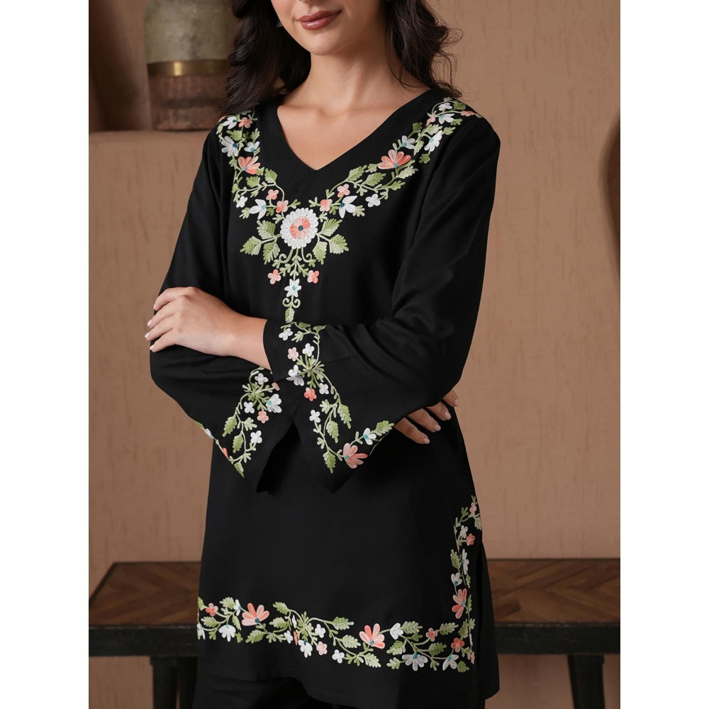 Description : Garner all the attention in this black kurta set from QAZMI. Crafted from viscose rayon, this alluring set is finished with full sleeves and a v-neck. Team this set with a pair of heels and minimal jewellery.