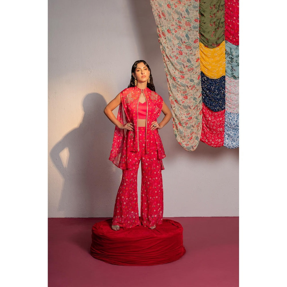 Redpine Designs Hot Pink Printed, Embroidered Cape with Bustier and Pant (Set of 3)