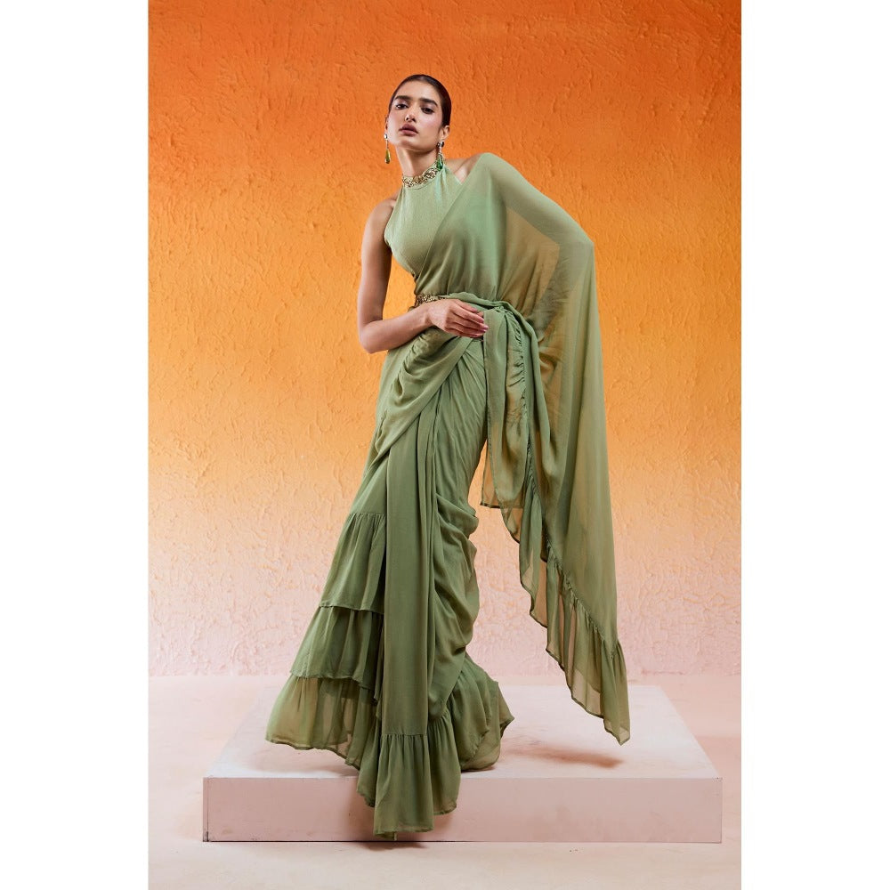 Redpine Designs Pista Green Embroidered Pre Drape Saree with Stitched Blouse and Belt