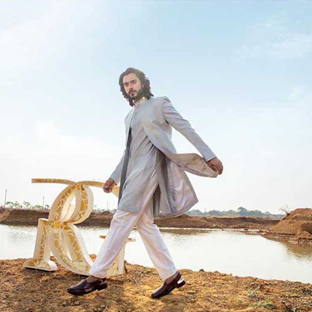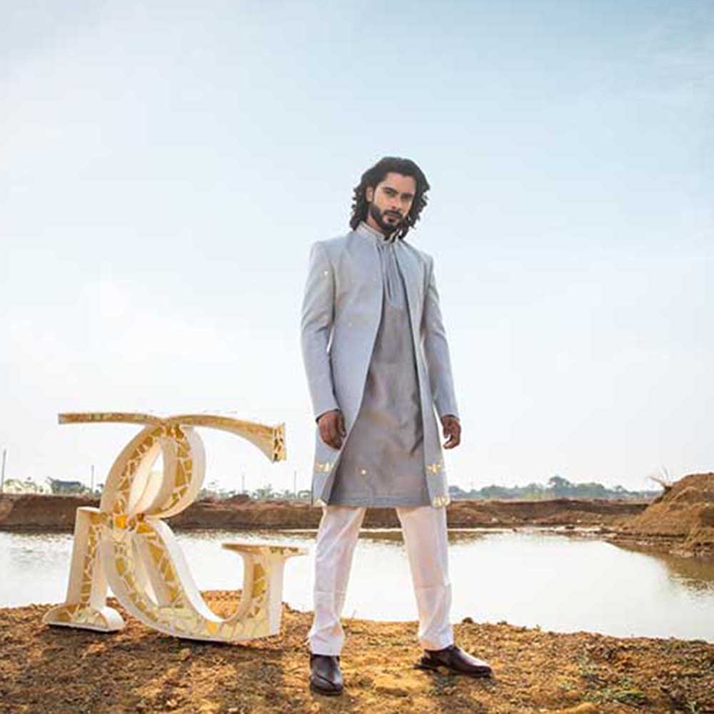Description : Leave the crowd spellbound by stepping out in this captivating smoke grey sherwani with kurta and pant from Runit Gupta. Made from high-quality chanderi, this piece features full sleeves and a mandarin neck. Style it with a watch and shoes to complete the ensemble.