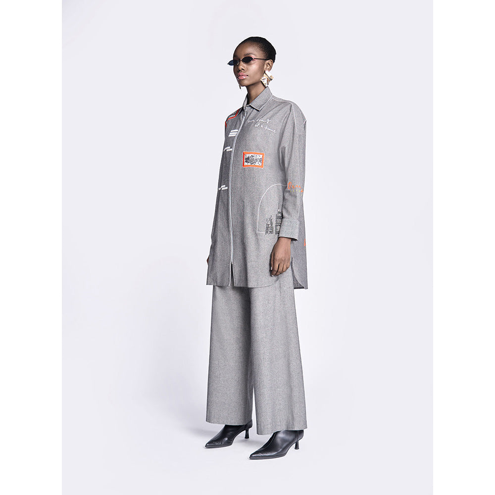 Description : Overshirt with embroidery of Big Ben, fish patches, abstract lines, and text. It has metal zip on the front and top stitching detail. It is paired with matching flared Pant.