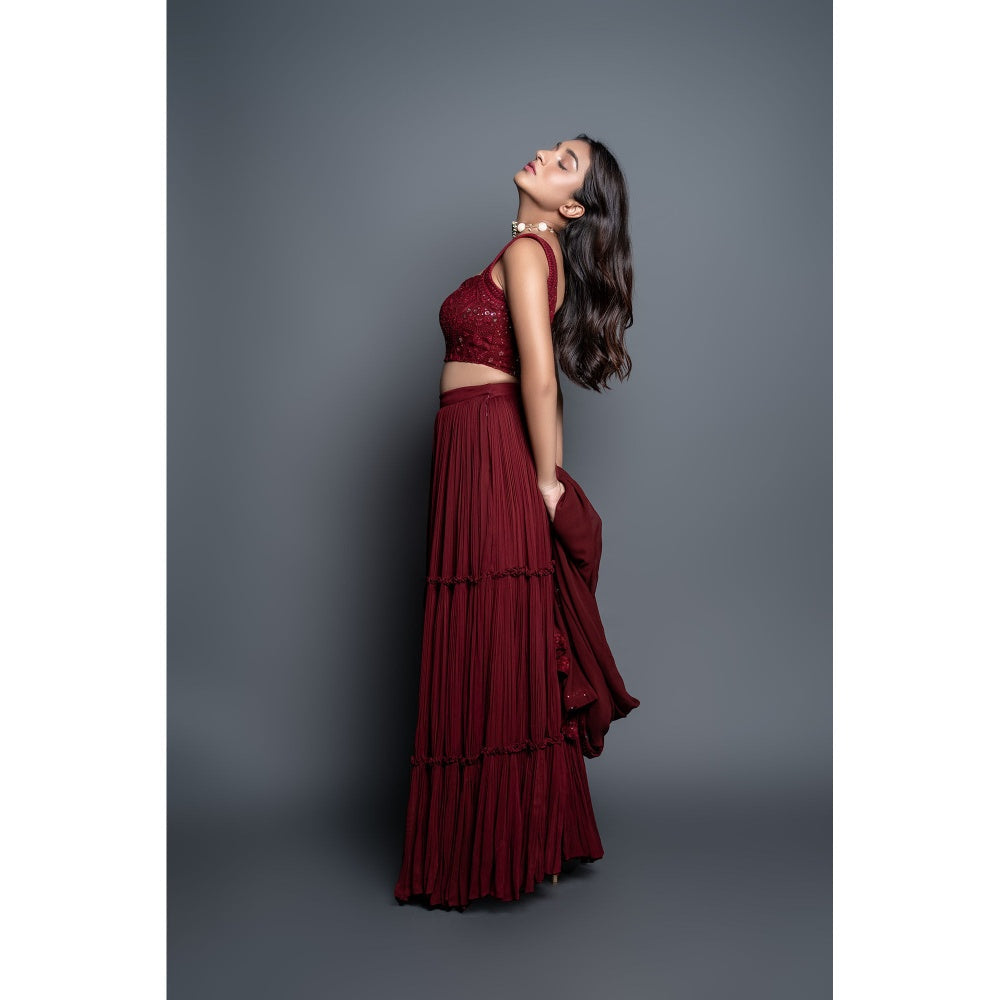 Maroon Chikankari Pleated Lehenga Blouse & Dupatta (Set of 3)