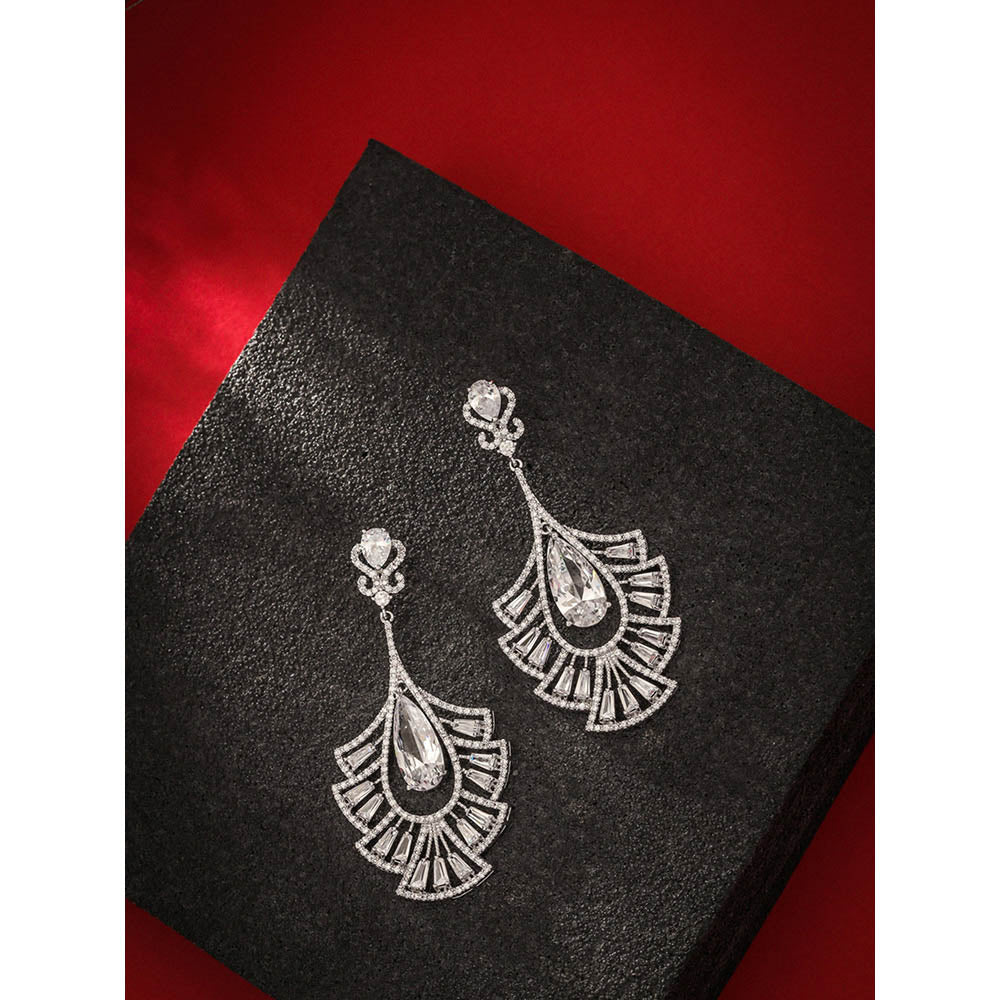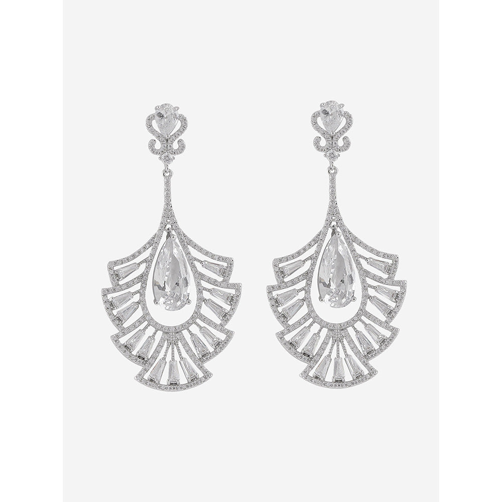 Shaze Silver Rhodium-Plated Cubic Zirconia Drop Fan Earrings for Women