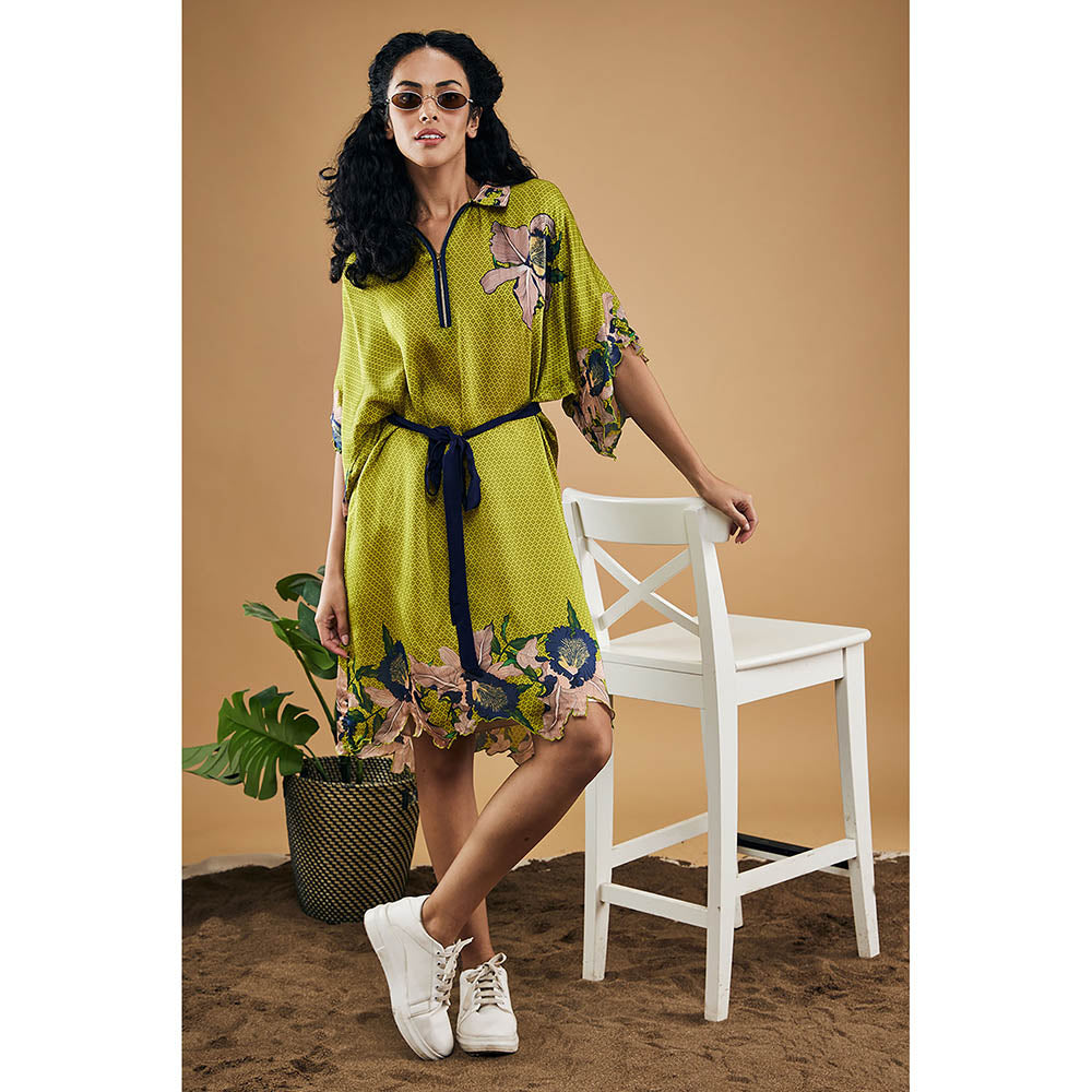 Green Orchid Bloom Printed Kimono Dress with Belt (Set of 2)