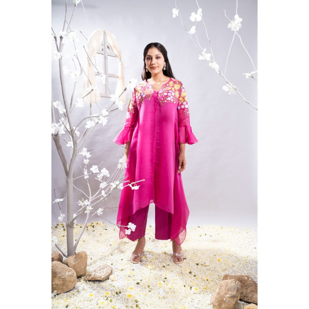 Description : Fuchsia pink cotton chanderi kurta featuring a high-low hem pattern creates a stylish and flattering outfit. The kurta's neckline, shoulders, and sleeves are beautifully embellished with floral applique and badla work.