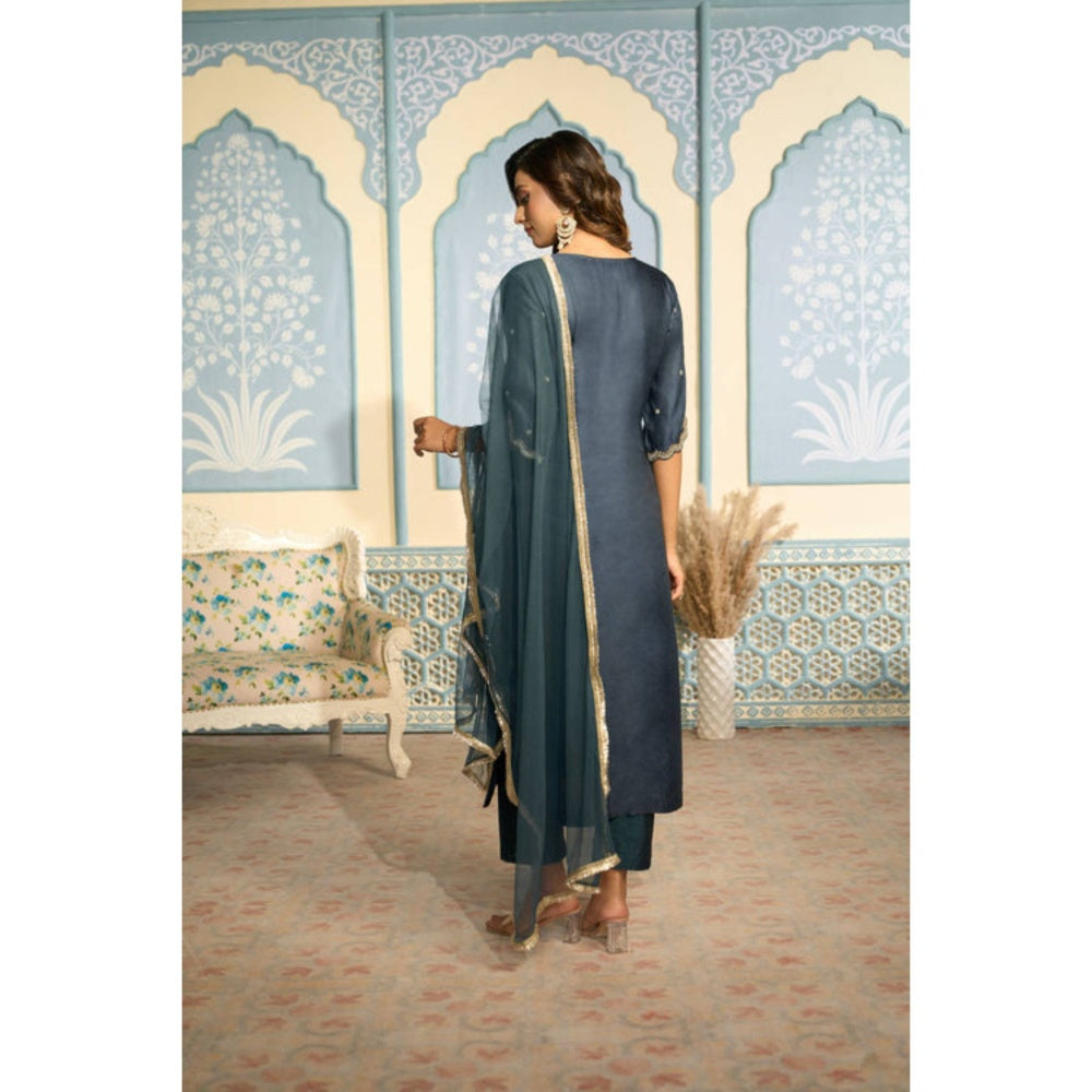 Exquisitely Crafted, This Set Displays A Captivating Navy Satin Embroidered Kurta. The Graceful Allure Is Enhanced By A Masterful Blend Of Dabka, French Knots, Resham, And Zari Work. The Set Is Complemented By A Narrow Dupion Silk Pant And An Enchanting Dupatta With Tiny Booties. The Dupatta Fabric Is A Delicate Soft Net Bordered With Golden Lace.