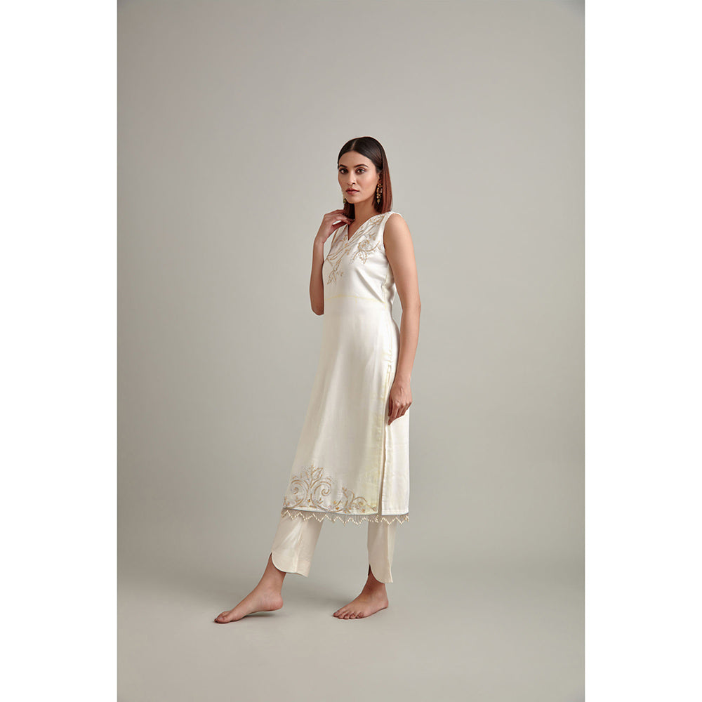 Description : Turn heads in this ivory kurta set from Vedika Soni. Crafted from cotton satin, this beautiful set is finished with a sleeveless design and a V-neck. Style it with a pair of heels and exquisite jewellery.
