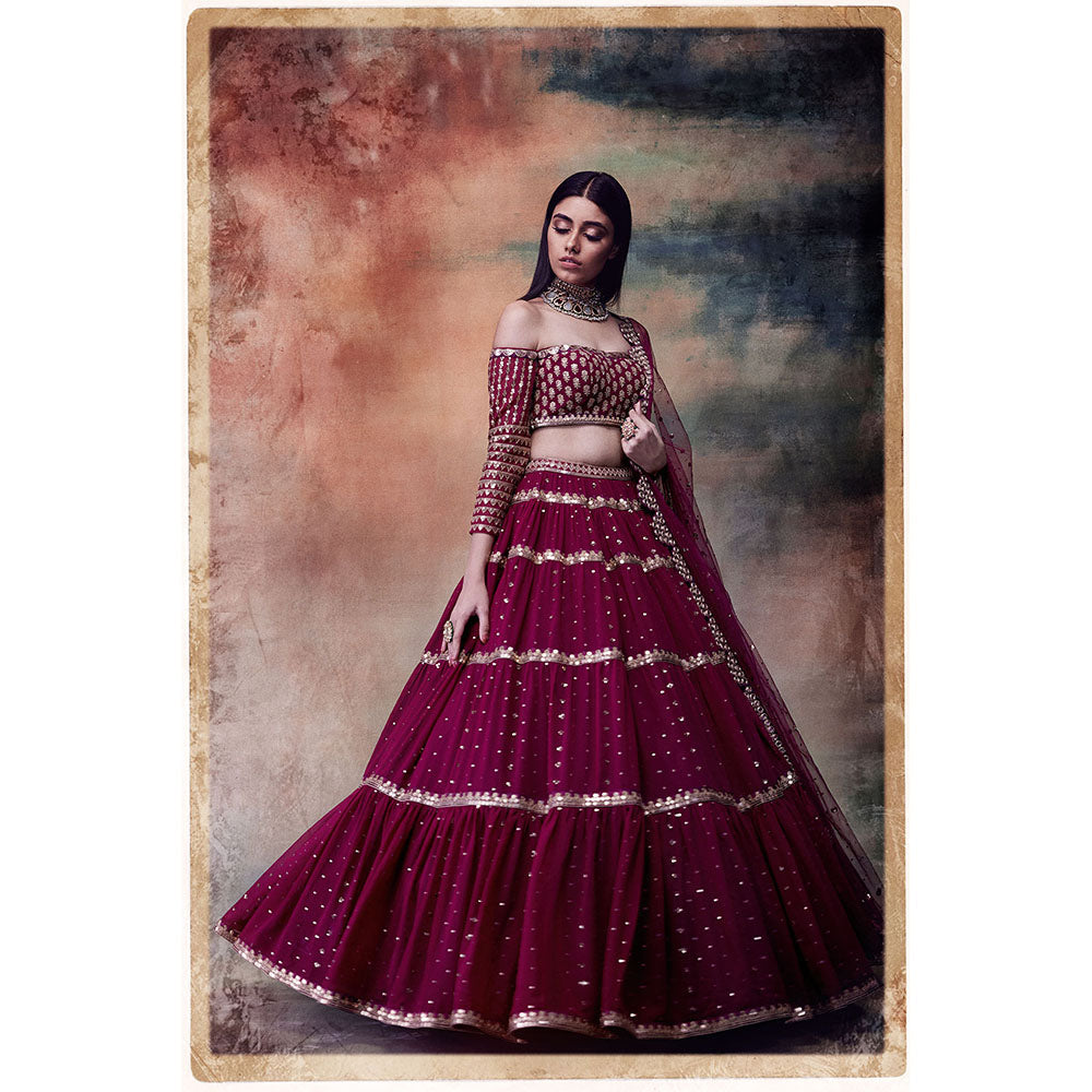 Vvani by Vani Vats Maroon Off Shoulder Tier Blouse with Lehenga & Dupatta (Set of 3)