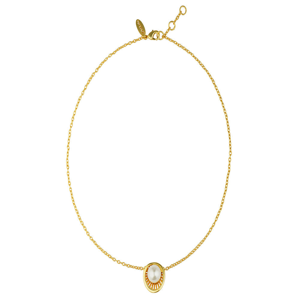 Description : A simple pendant necklace with pearl is a keeper and makes a great option for everyday wear. You ll find yourself gravitating towards the piece everytime you are looking for something classy and effortless. The pearl is set in a 22kt gold dipped oyster inspired shell. The ivory and gold combination of the necklace makes it a refreshing summer pick. Wear the pendant necklace with matching earrings from the collection for a more put together and coordinated approach