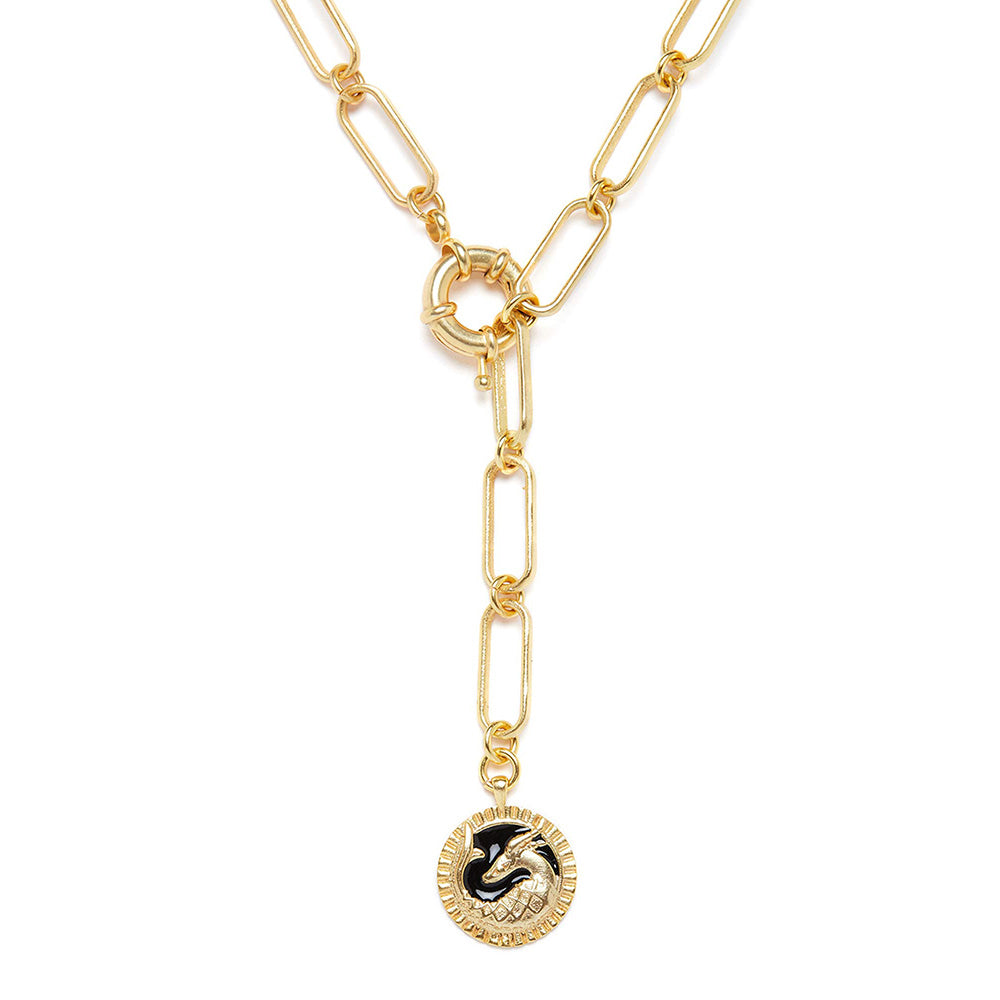 Description : An ultra modern 22kt gold dipped link lariat necklace by Zariin that boasts of a sleek design and versatility. Capable of being worn and styled in three ways, the necklace inspires the wearer to create a unique look while establishing a talismanic connect with the Zodiac sign crafted on the gold dipped and enamelled medallions that hold the sculptured motifs of "The Sea Goat" - symbol for Capricorn. They embody ambition and love of enduring traditions.