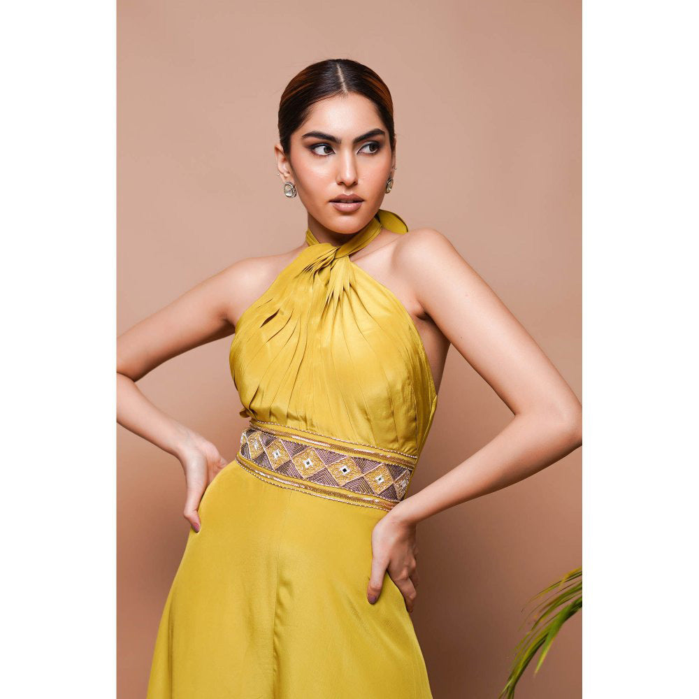Description : Structured pleated drape halter neck bodice and heavy embroidered belt attached in the middle handworked with mirror , cutdana , zari and contrasting resham . Attached flared bottom with back zip and tie-up on the neck .Neckline: halterSleeves: sleeveless