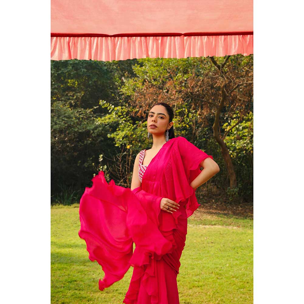 Ajiesh Oberoi Crystal Jaal Work Heavy Stitched Blouse With Pre Drape Saree - Pink