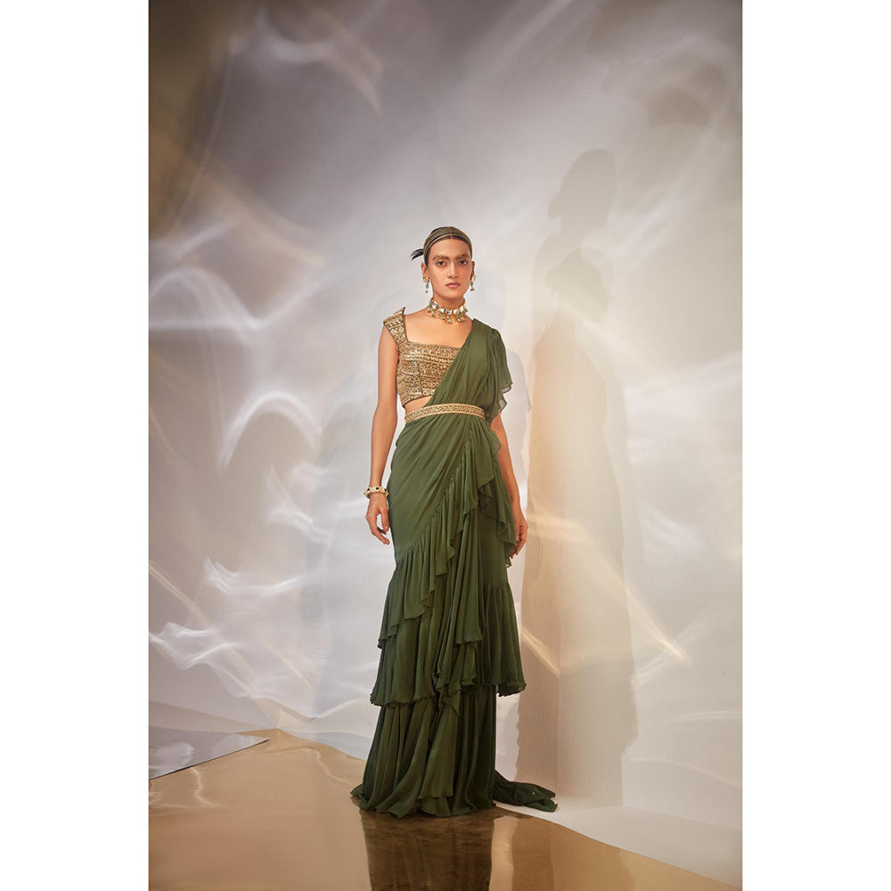 Women's Ruffle Embellished Pre Drape Saree with Stitched Blouse & Belt