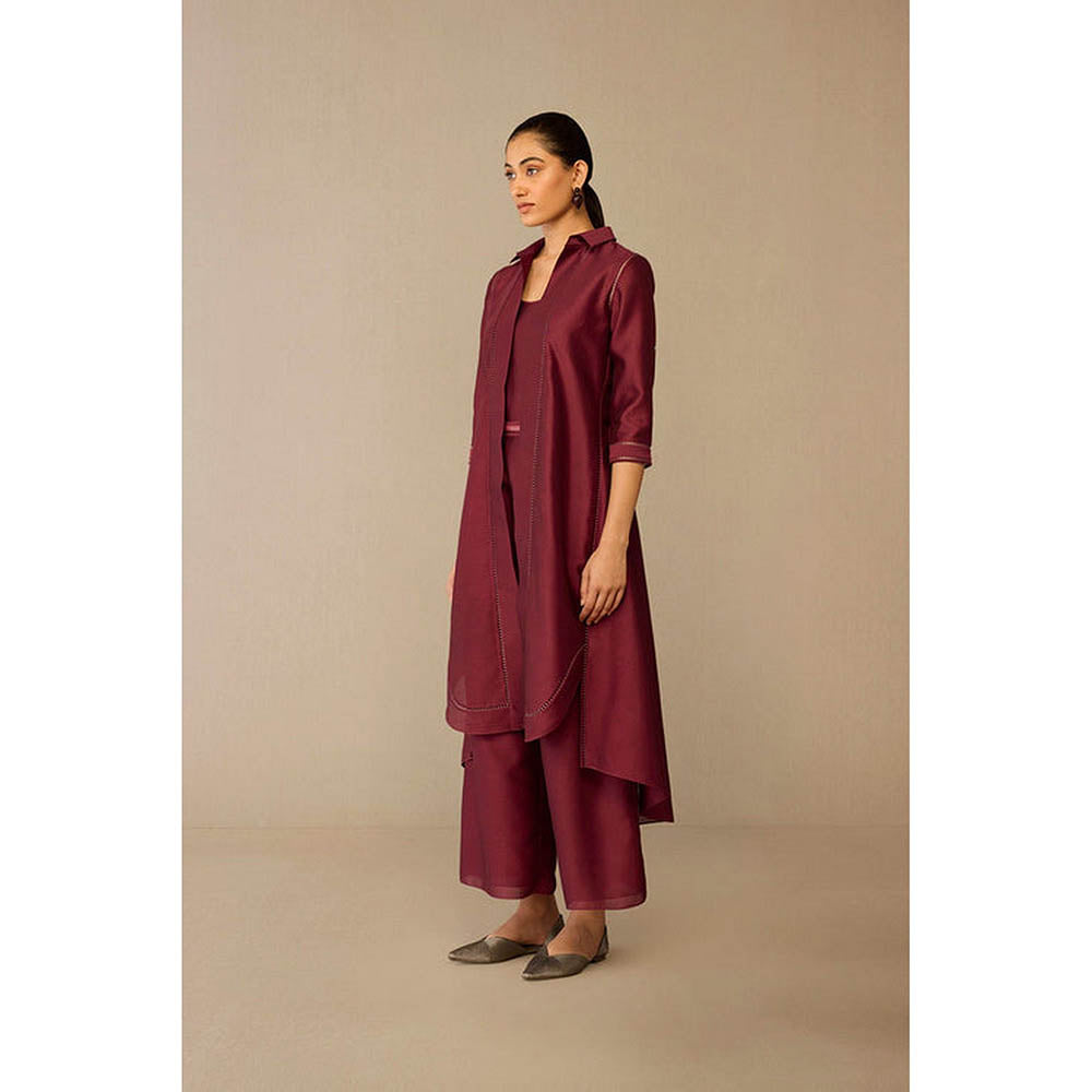 Description : Revamp your wardrobe with this red co-ord set from AMPM. Crafted from chanderi, the top features three fourth sleeves and a collar neck. The bottoms are designed with a high waist and wide legs. Team it with a pair of sandals and minimalistic jewellery to complete the look.