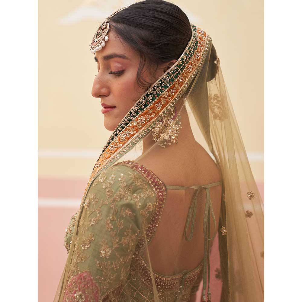 ANGAD SINGH Green Raw Silk Lehnga with Blouse & Dupatta (Set of 3)