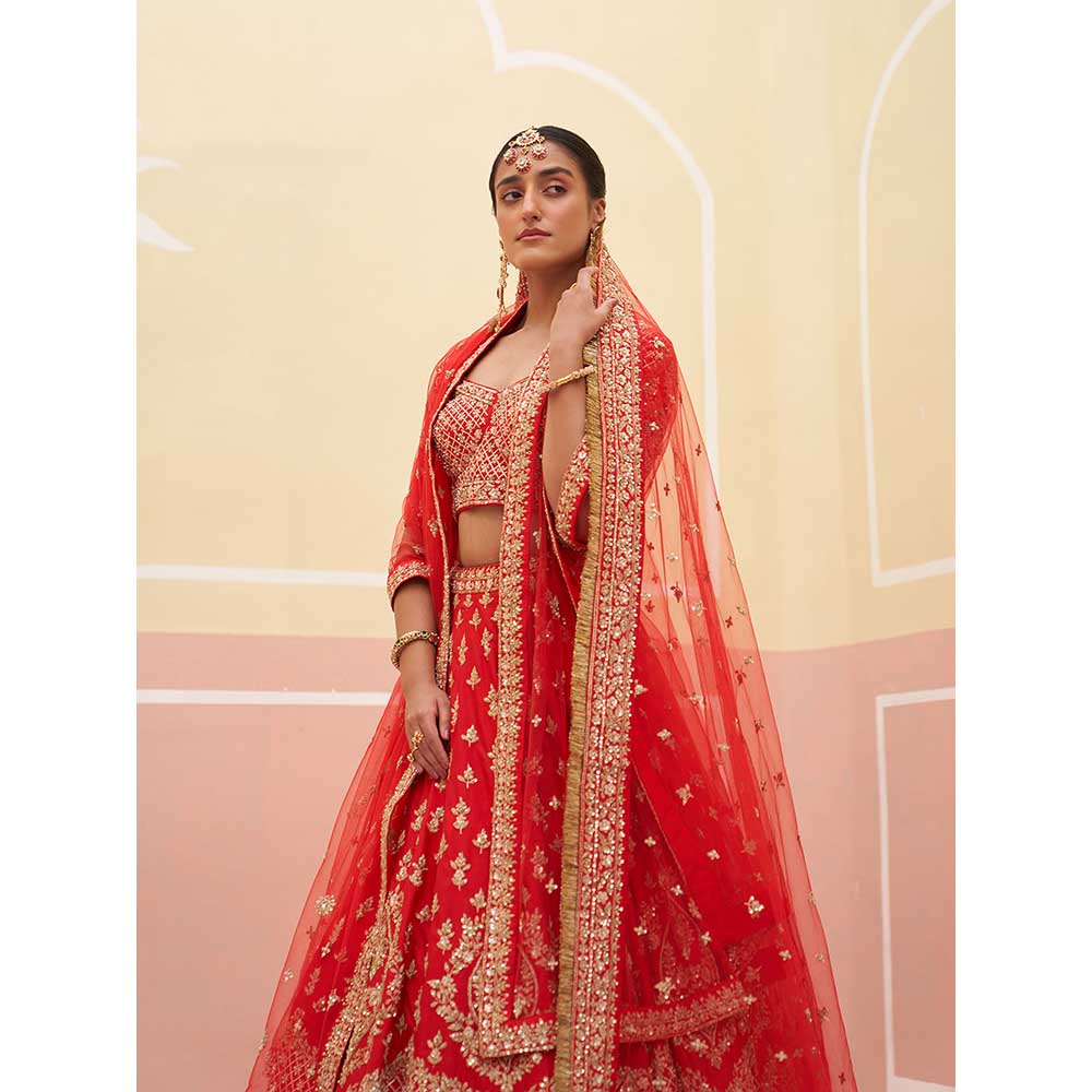 Description : Get your wedding look sorted with this red lehenga choli from ANGAD SINGH. Crafted from raw silk and embroidered with traditional zardozi technique using silken threads, it is finished with half sleeves and a sweetheart neck. Complete the look with heels and statement jewellery.