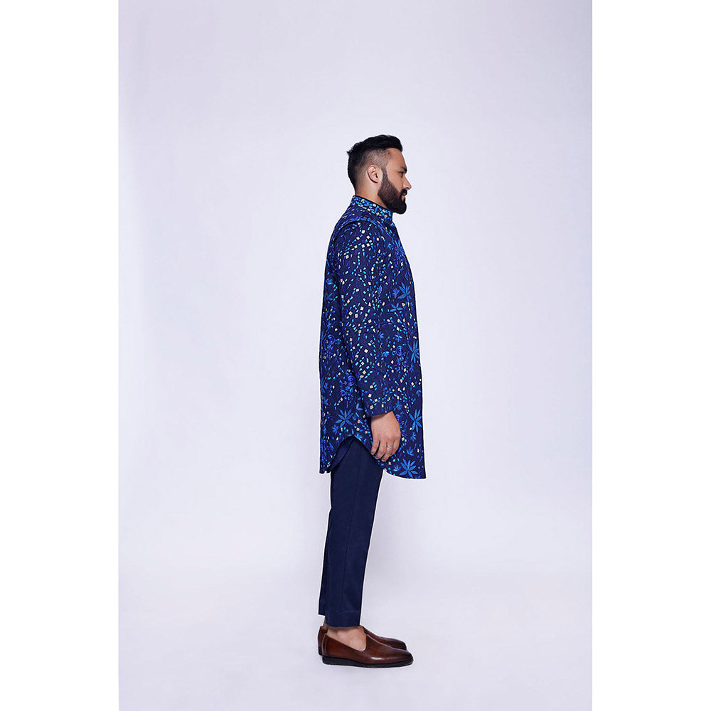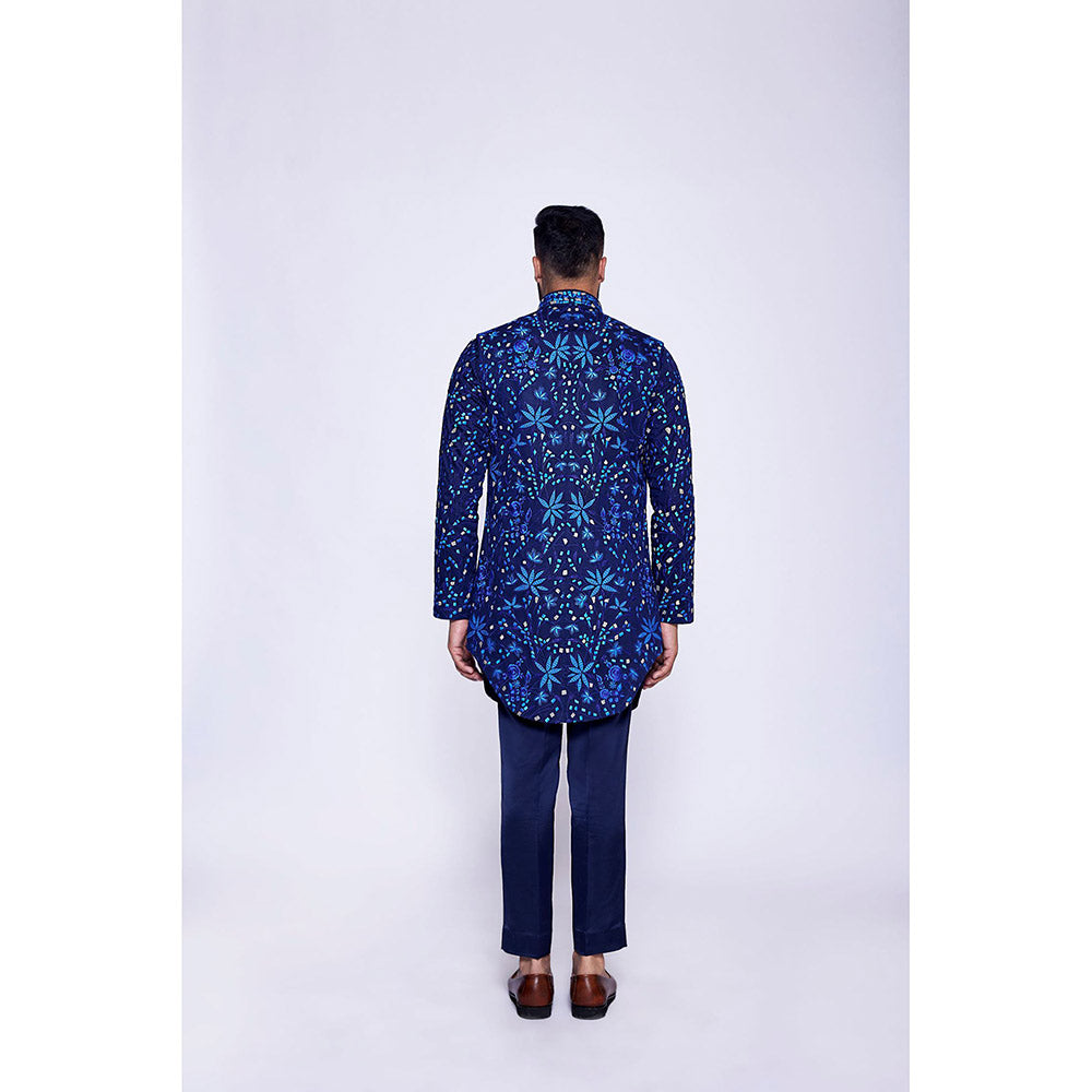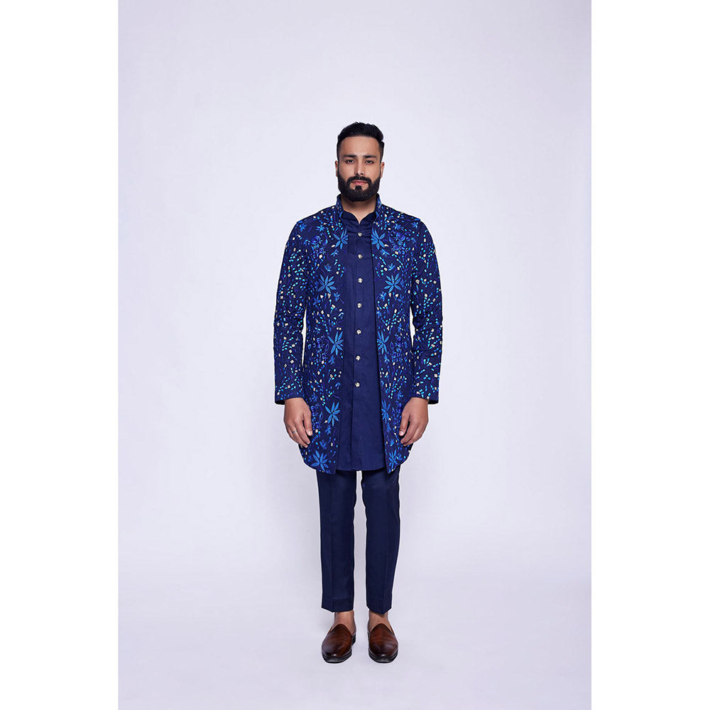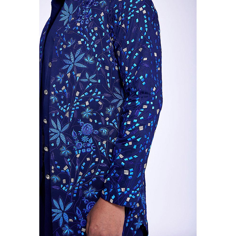 Description : Navy Blue Floral Tropical Embroidered Open Long Bundi Set. Tailored to sartorial perfection from premium quality fabric, it assures a soft and soothing touch against the skin. The exquisite silhouette adds to its appeal.