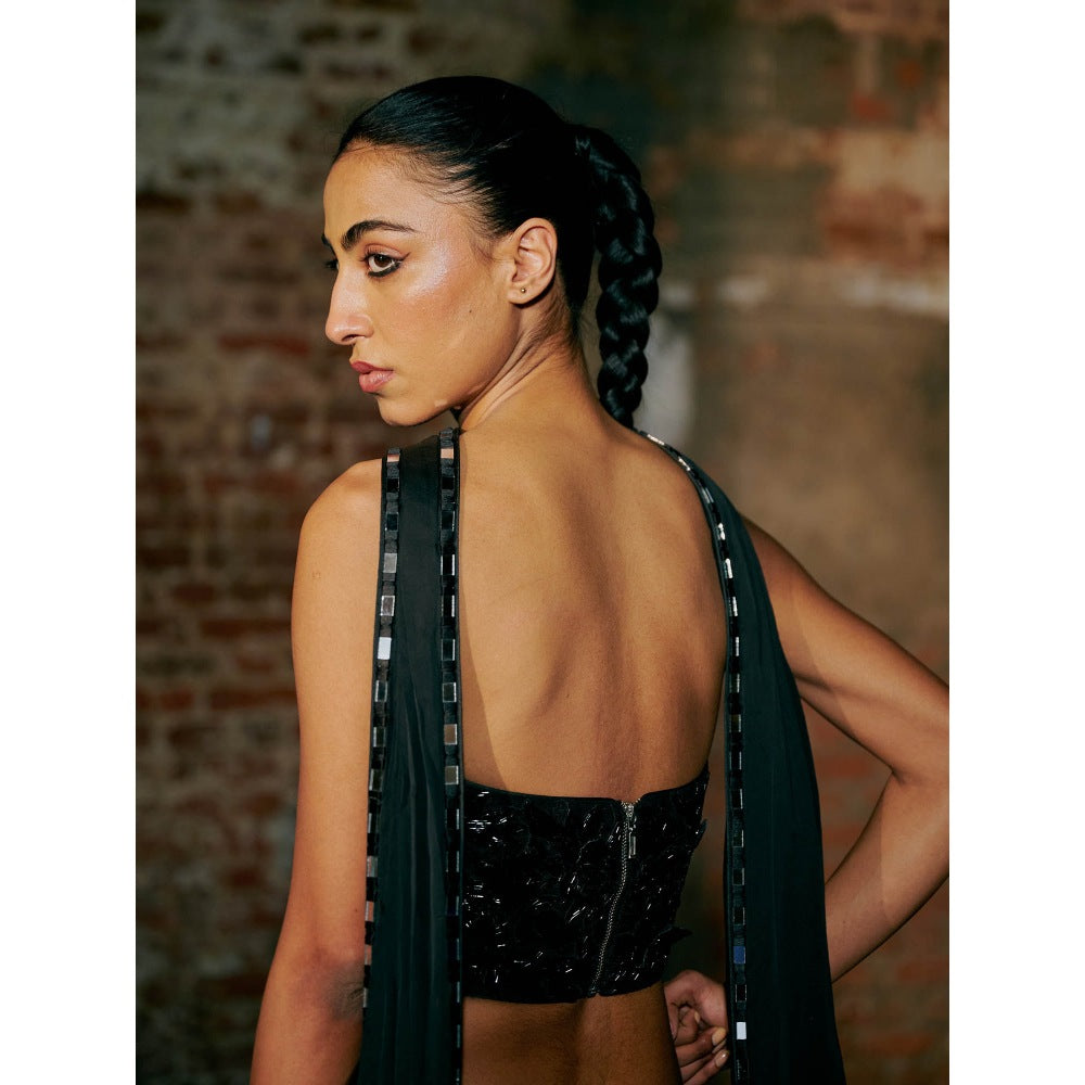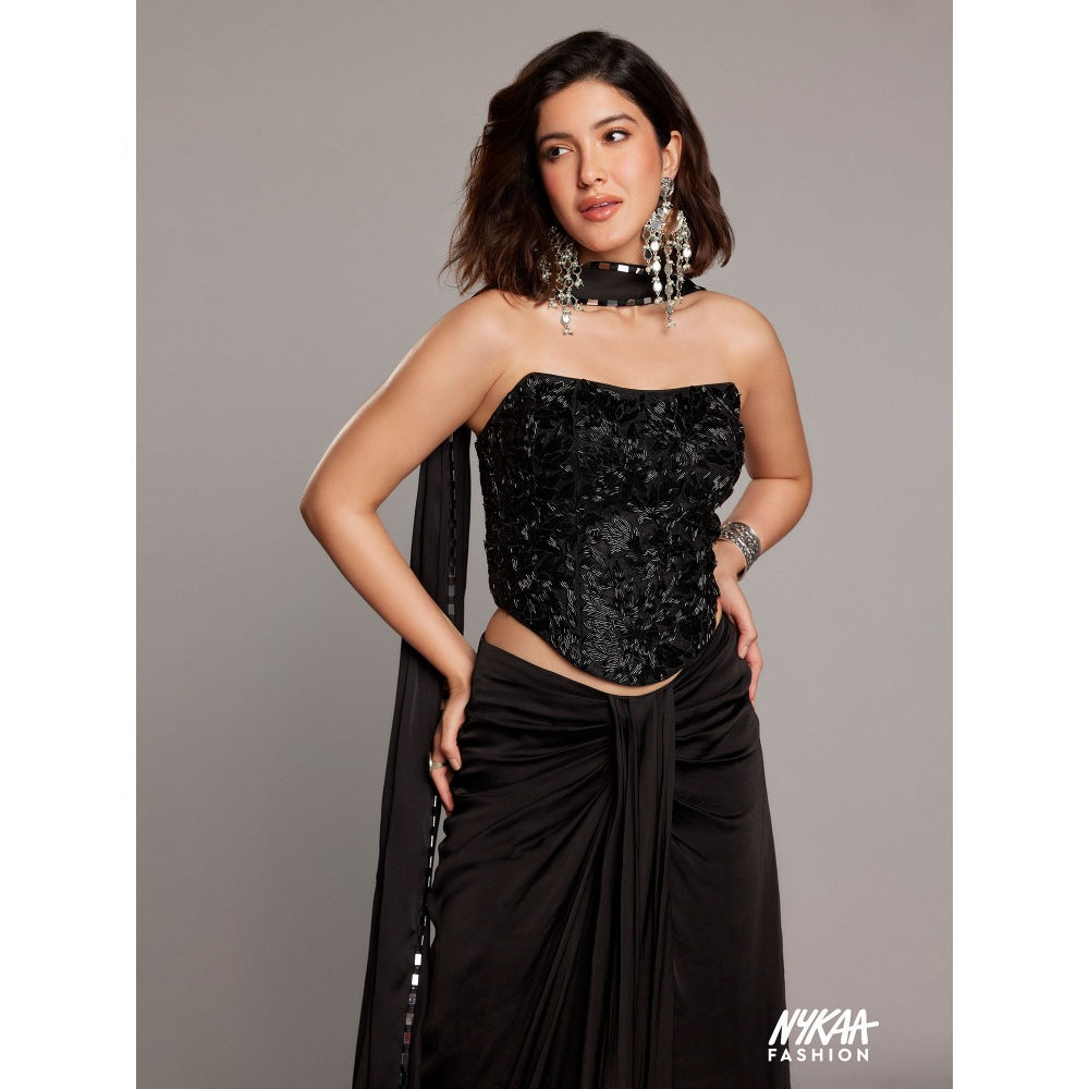 Asaga Black Flutter Tulle Blouse with Lehenga and Dupatta (Set of 3)