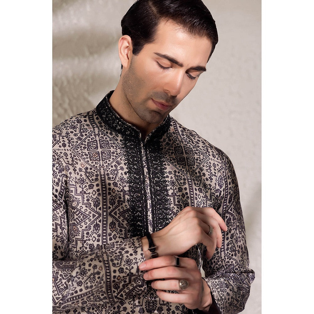 Description : Make a statement with the Naqshdar Threadwork Kurta, designed with a distinctive all-over pattern in beige and black that draws inspiration from traditional tile and carpet motifs. The intricate geometric print creates a visually rich surface, while the contrasting black threadwork on the placket adds texture and depth. Cut in a straight tailored fit, the kurta features a mandarin collar, full sleeves, and side slits for ease. The front placket is enhanced with tonal and fine embroidery, adding subtle elegance without overpowering the design. Crafted from a lightweight, breathable fabric, it s suited for festive gatherings and cultural occasions alike.