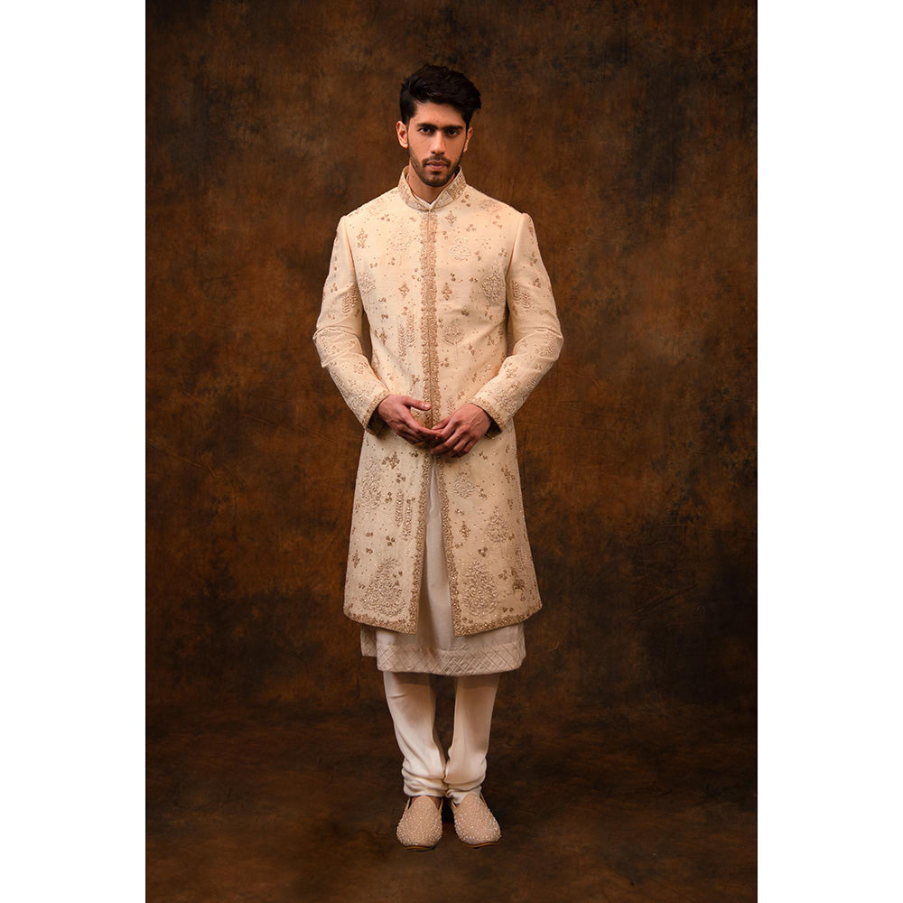 CHAR CHAAND Enchanted Ivory Floral Beaded Sherwani with Kurta and Churidar with Stole