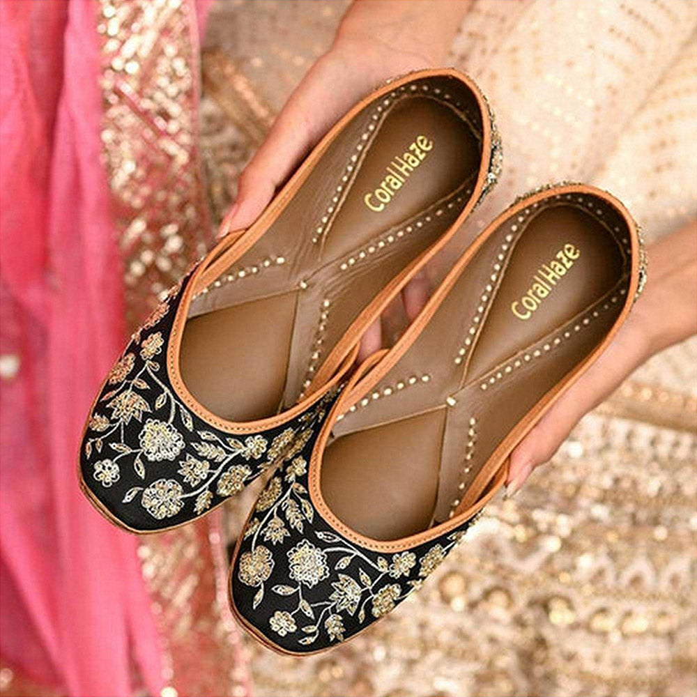 Description : Elevate your outfit with these black juttis from Coral Haze. Crafted from taffeta with rubber sole, this stylish pair offers both comfort and durability.