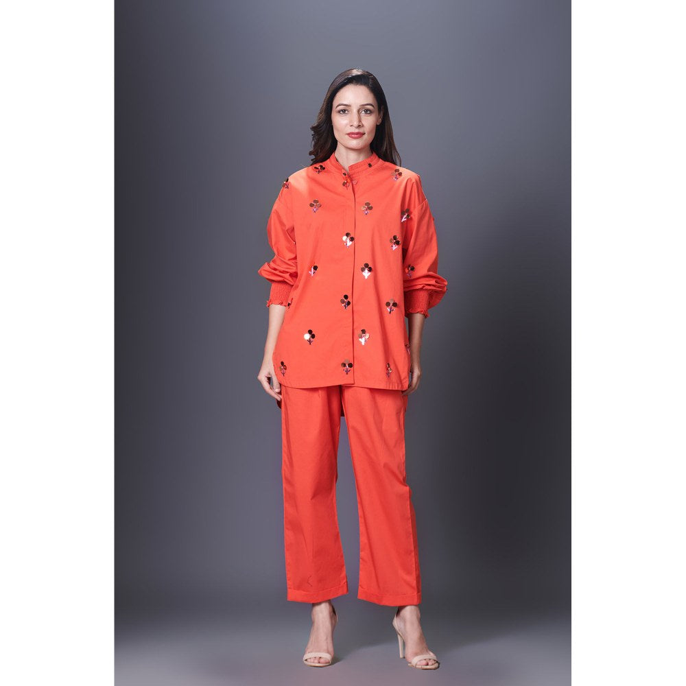 Description : Orange Hand Embroidered Shirt With Pants Co-Ord Set