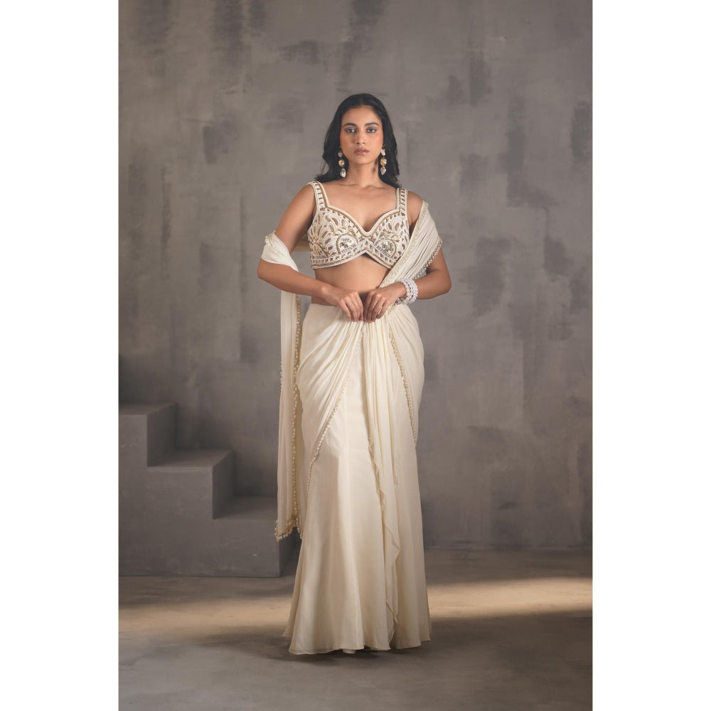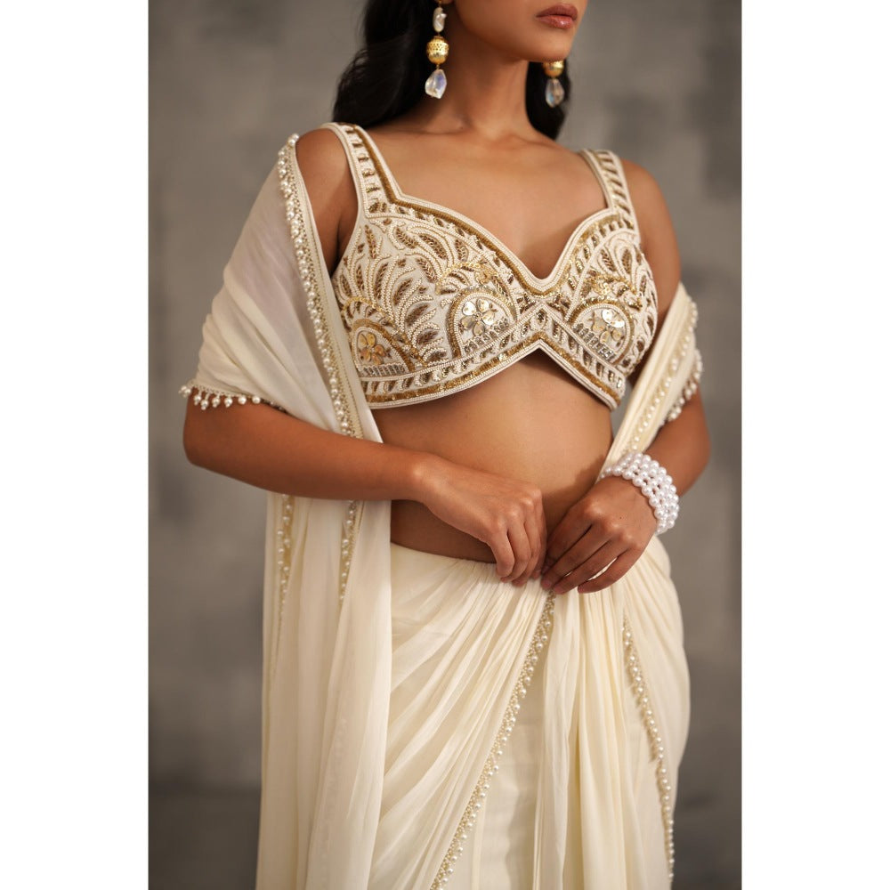 Deepika Chadha Ivory Embroidered Pre-Draped Saree with Stitched Blouse