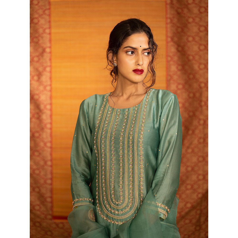 DEEPTHEE Turquoise Hand Embroidered Kurta with Skirt & Dupatta (Set of 3)
