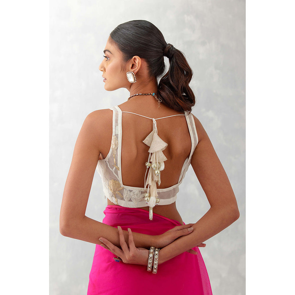 Description : The fuchsia pink saree features our finest thread and pittan work embroidery over the delicate silk organza base. The outfit is paired with an ivory cotton silk satin blouse, adorned with thread and pittan work embroidery all over.