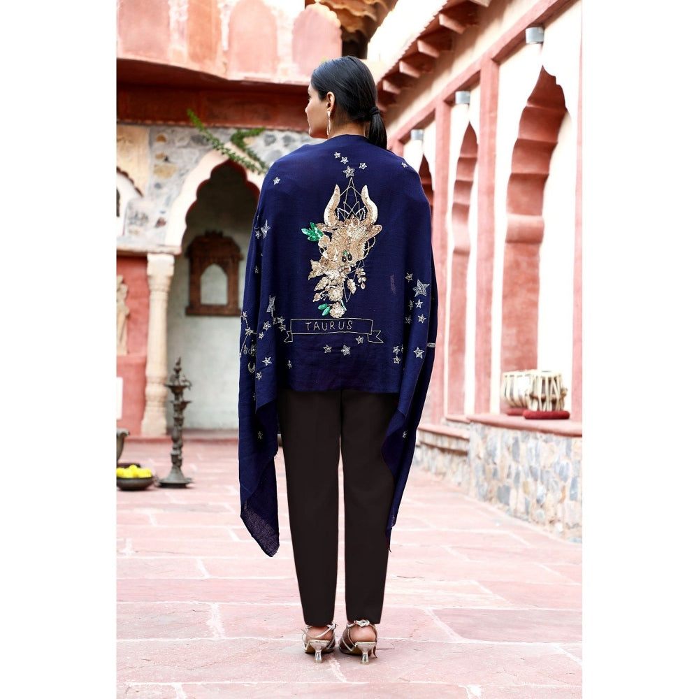 Description : This stole adds charm to your unique taste. Wrap your shoulders with your favorite stole. clothing. You can flaunt this stole on all occasions. You can wear this anywhere, from an office party to your festive gatherings. The blue-colored stole has an Aries theme with golden stars and the head of the Ram. This stole has a design of sequence pipe work and thread work. The fabric feels so smooth on your skin and gives you warm comfort in winter You will definitely earn compliments on this stole.