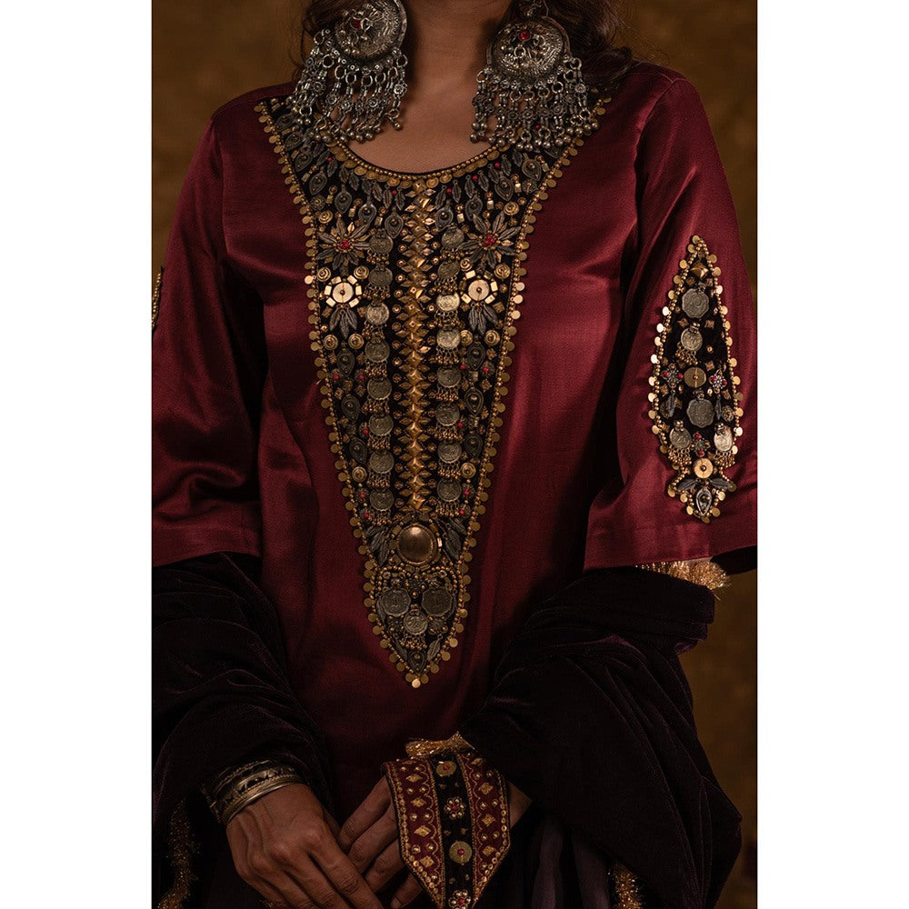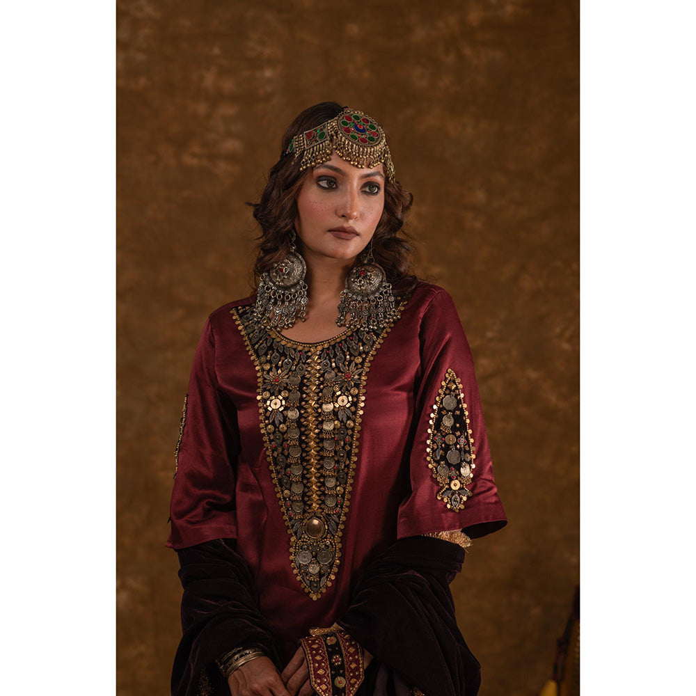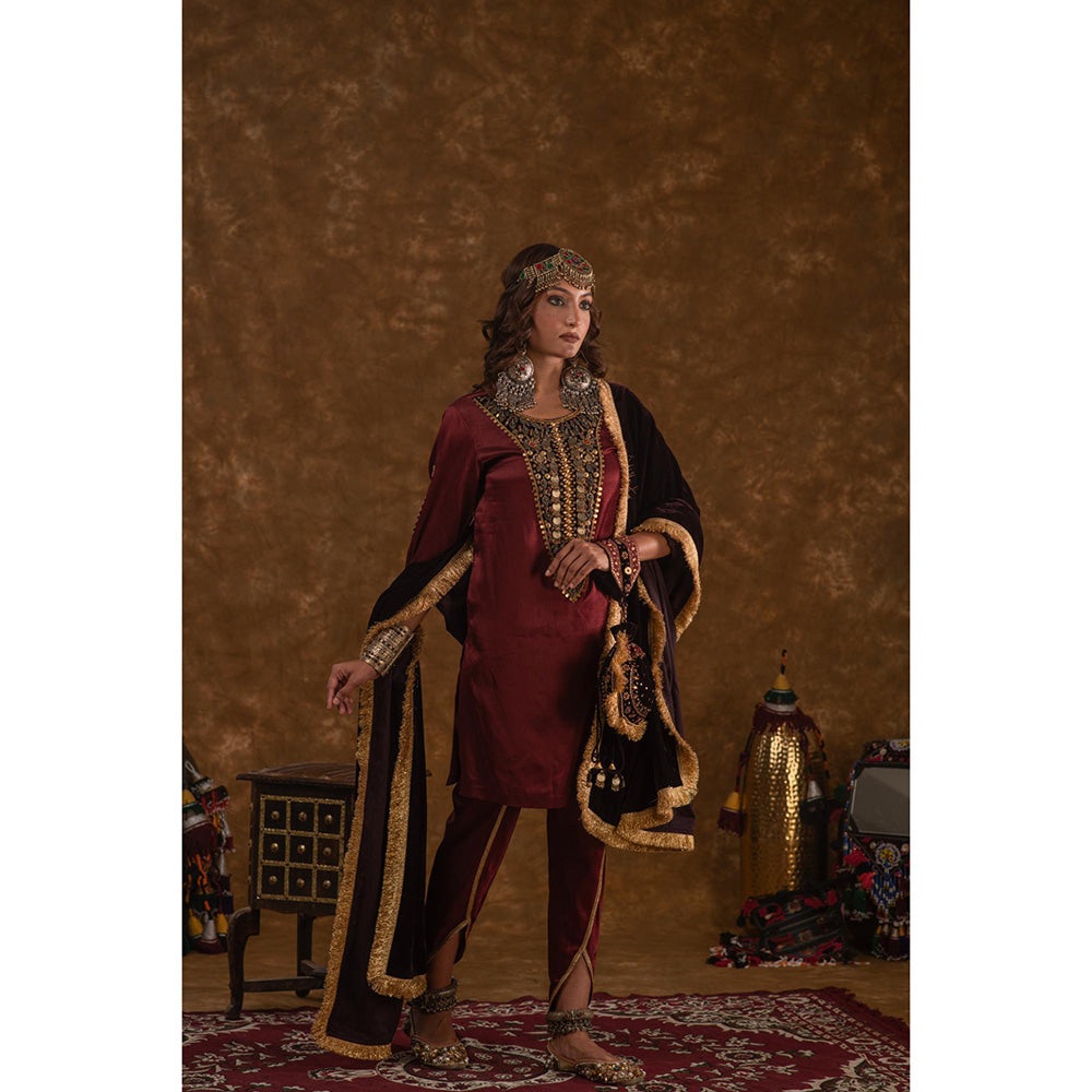 Description : This Elegant Suit Set From The Raahi Collection, Named Rubina, Showcases The Intricate Hand-Dyed Mashru Silk From Kutch, Blending Traditional Craftsmanship with Contemporary Design. The Short, Straight Kurta Features A Maroon Base Color and Is Adorned with Afghani-Inspired Coin Work On Contrasting Wine Velvet Patch , Adding A Striking Detail That Mirrors The Cultural Fusion Of The Collection. The Kurta Includes Practical Slit Pockets and Is Paired with Tulip Pants, Offering A Flattering and Comfortable Silhouette. To Finish The Look, Pair It with Our Velvet Orhni with Handpicked Trims. With Its Refined Detailing and Unique Silhouette, Rubina Beautifully Marries Heritage with Modern Elegance.