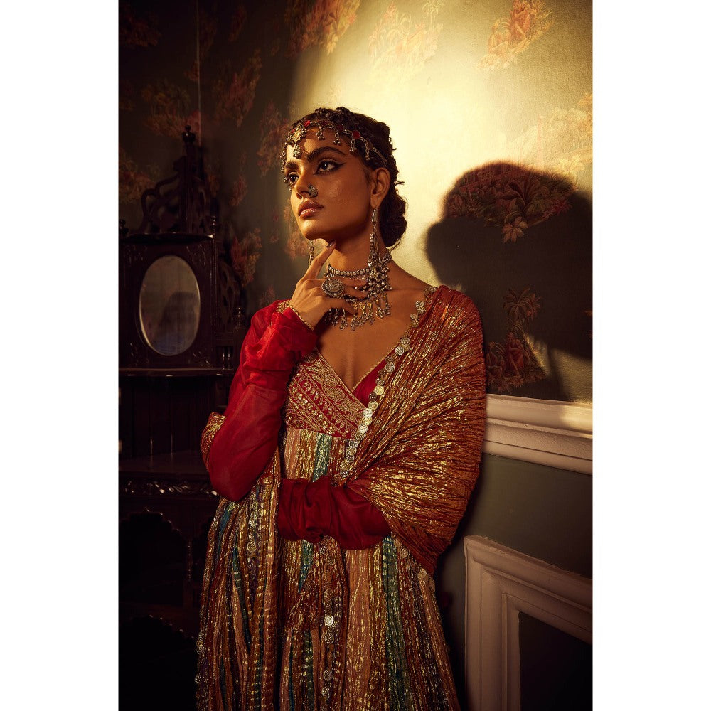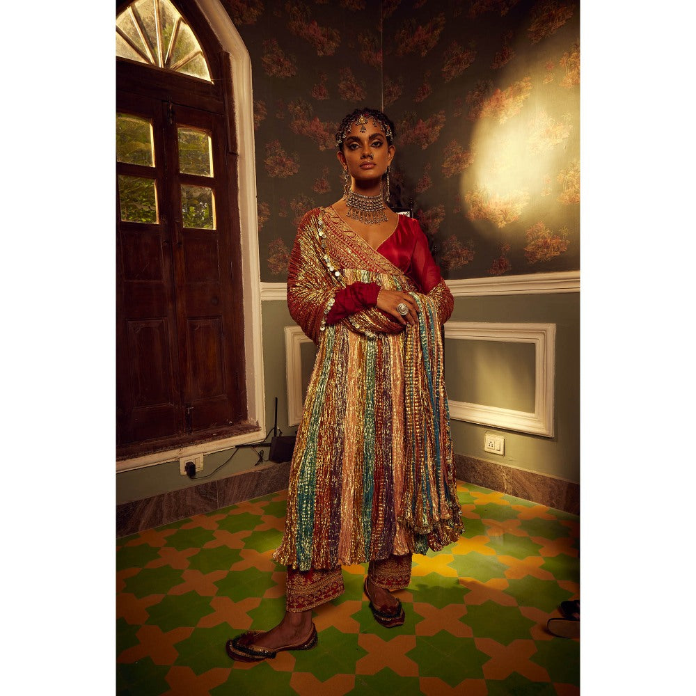 Description : The Colourful Metallic Textured Angrakha Embellished with Marodi Embroidery, Metallic Dupatta and Maroon Silk Pants