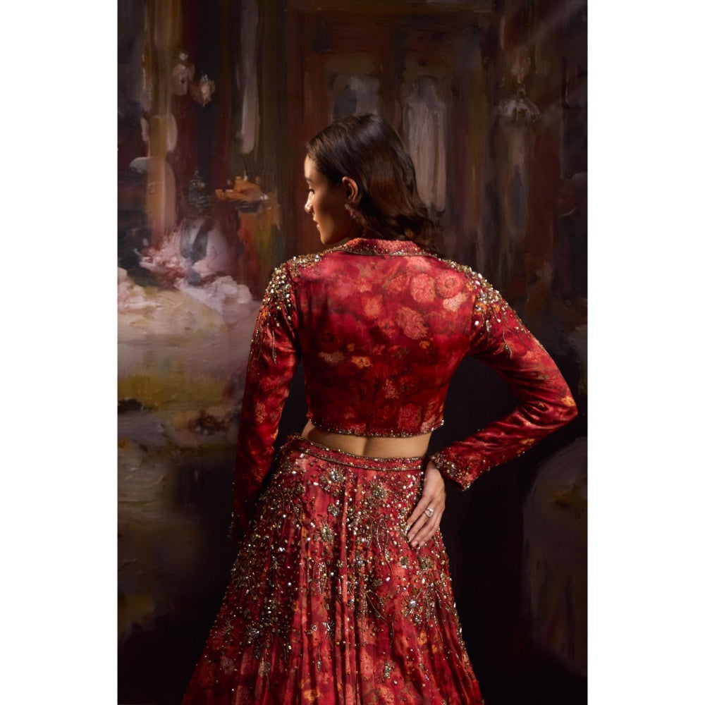 Description : Effortlessly stylish, this red embroidered crepe lehenga choli from FALSA. It is crafted from high-quality fabric. It features full sleeves and notched lapel style. It's the epitome of understated elegance, perfect for festive, wedding, or special occasions.
