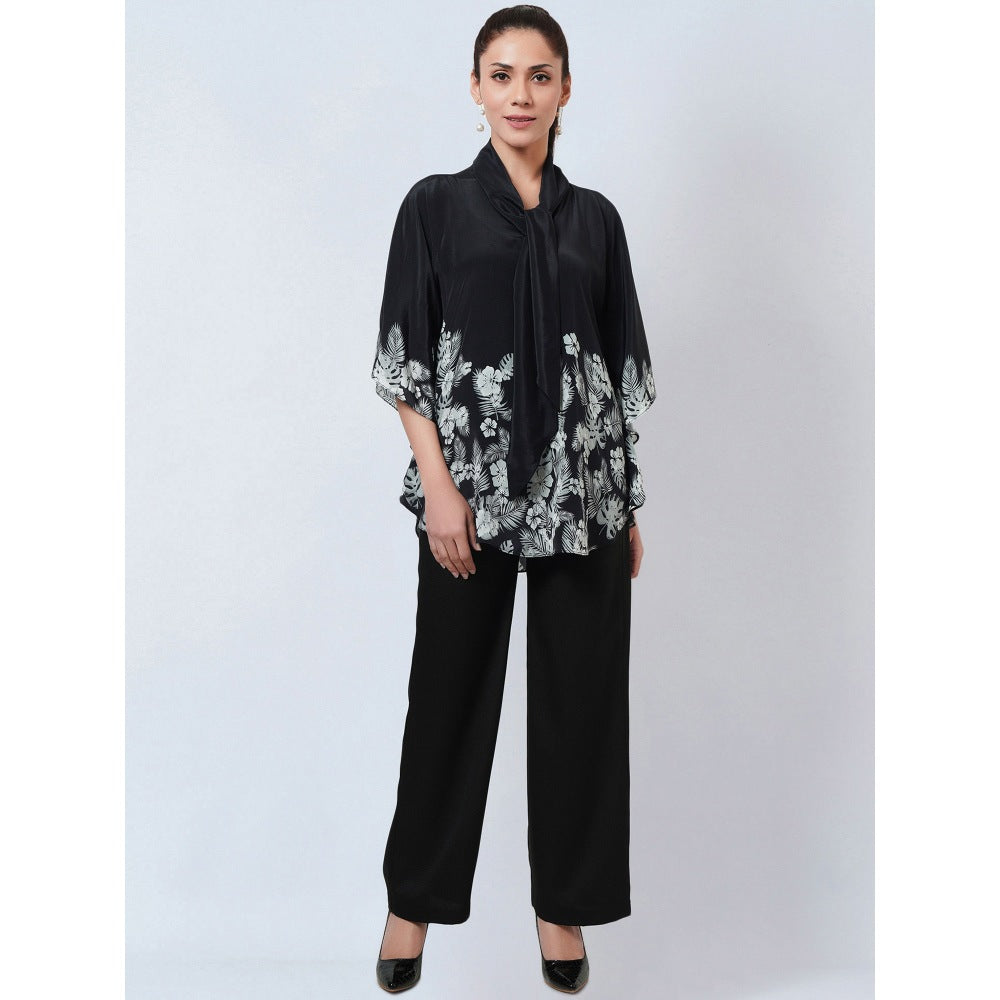 First Resort by Ramola Bachchan Black & White Floral Bow Tie Top