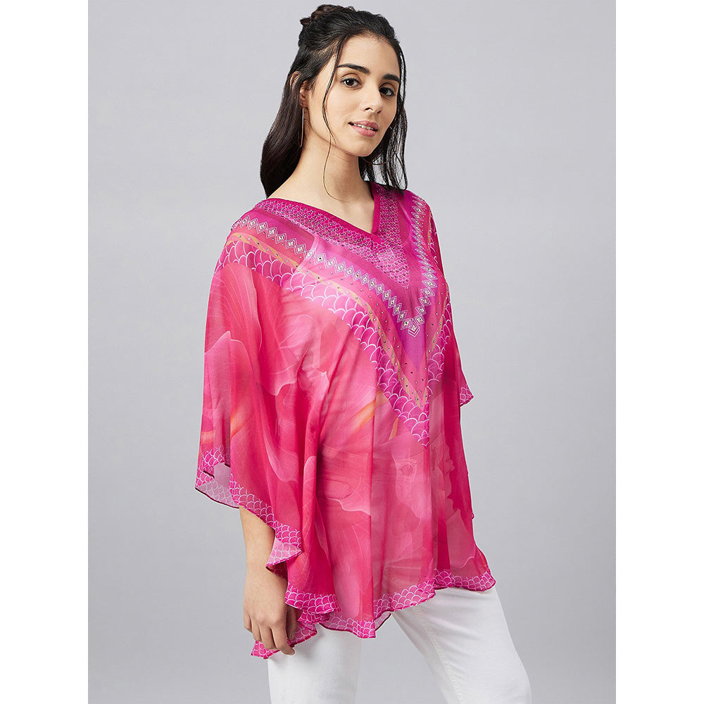 Description : If You Are Looking For Styles That Aren'T Just Simple But Young And Trendy, Then Grab This Pink Floral Printed Tunic. The Neckline Is Accentuated With Crystal Embellishment To Enhance The Beauty Of The Tunic.