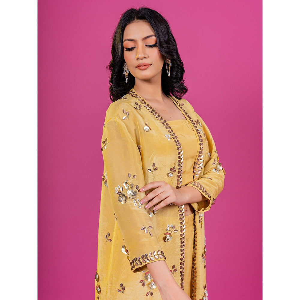 Description : Vibrant Yellow Floral Chanderi Co-Ord Set With Delicate Hand Embroidery, Paired With A Flowy Organza Jacket For A Stylish Fusion Look.