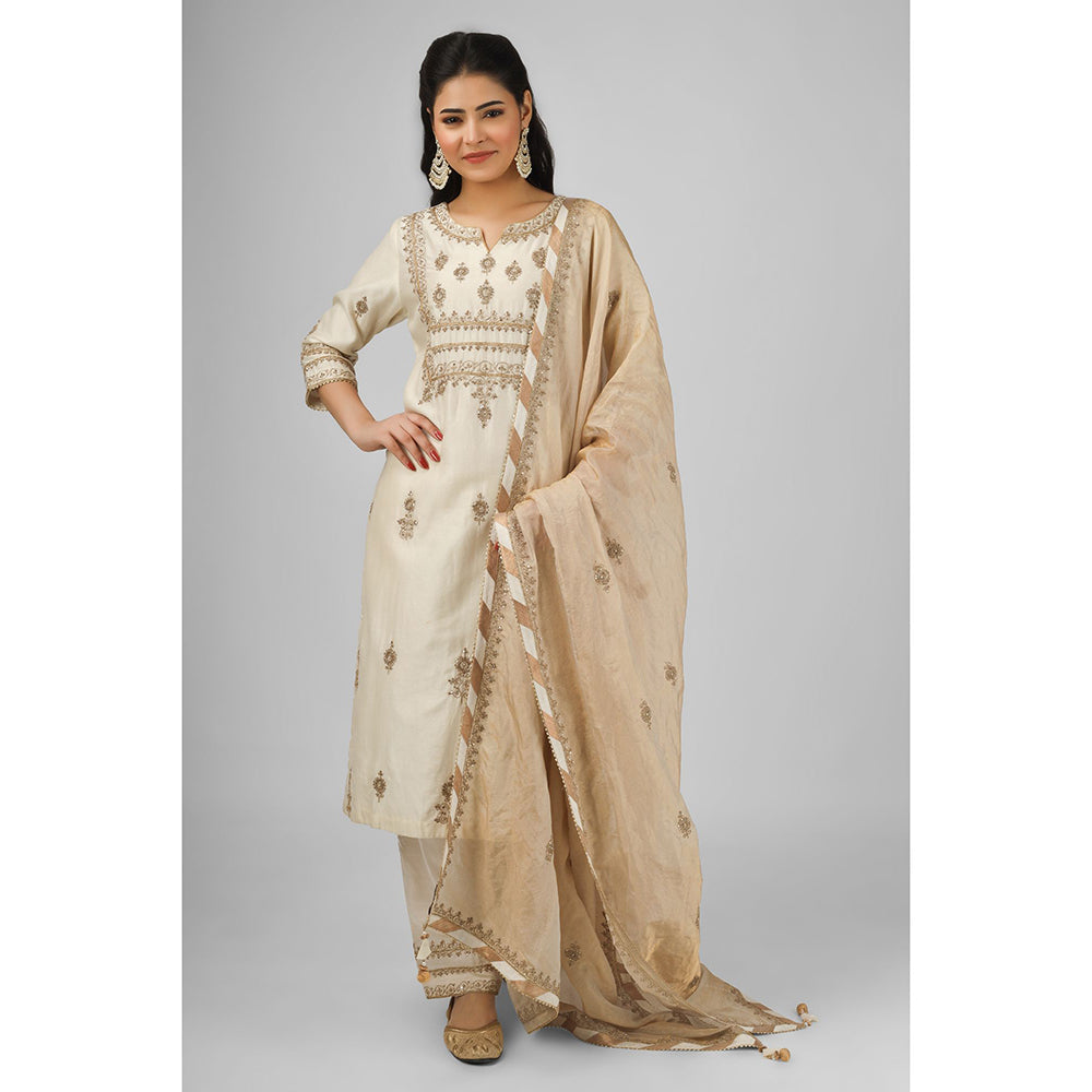 House of Supriya Off White Embroidered Silk Chanderi Kurta with Pant & Dupatta (Set of 3)