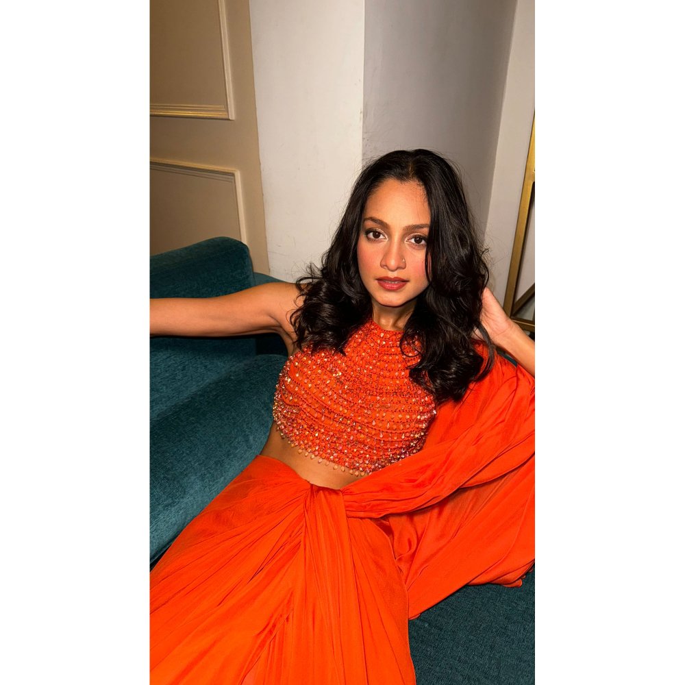 Description : Elevate your look with this chiffon draped saree in refreshing orange shade paired with high neck top from IRTH. Style it with minimal jewellery and heels to complete the ensemble.