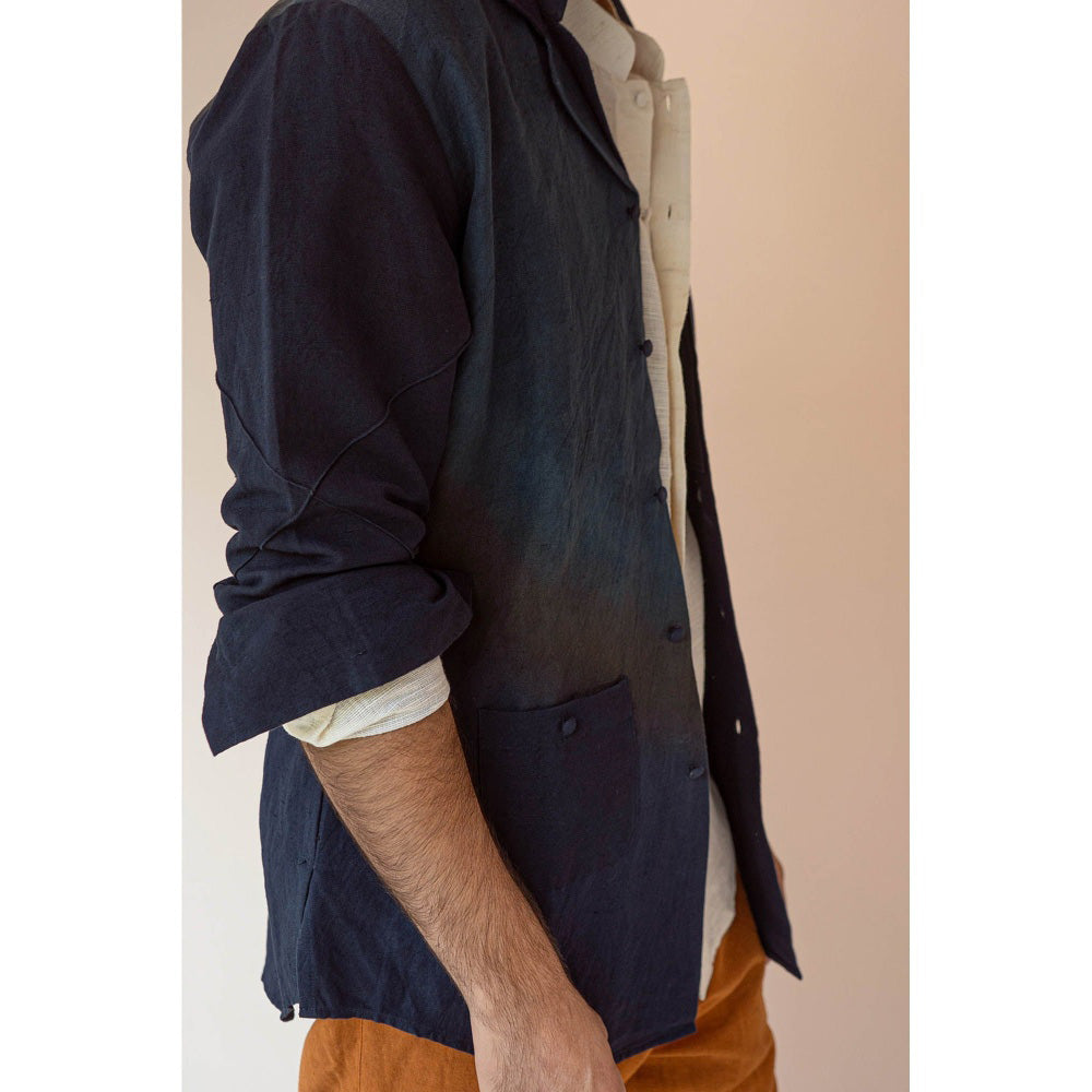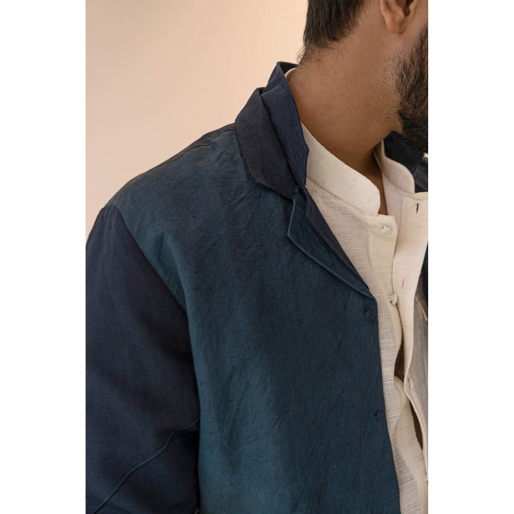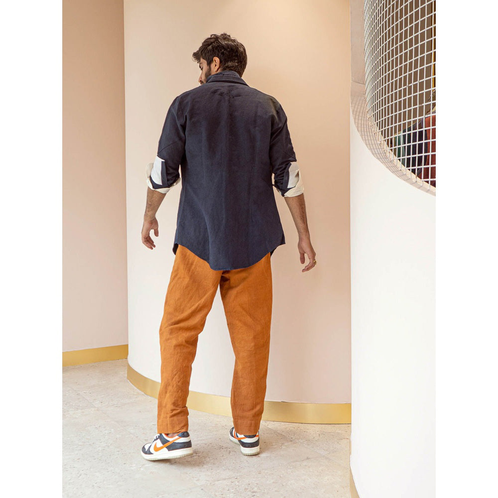 Description : Featuring The Colorblock Midnight Blue Overshirt With Double Lapel Cuban Collar Details. Paired With Ivory Detailed Shirt And Mustard Straight Cotton Linen Trousers.