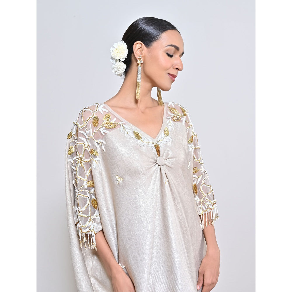 Description : Light gold shimmer foil crepe kaftan with ivory bead/ sequins flower motifs embroidered sleeve.