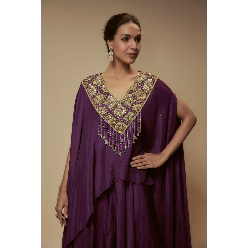 KEITH GOMES Purple Silk Flare Palazzo With Cape Top And Slip (Set of 3)