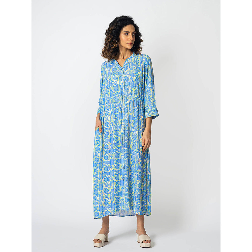 Klad Rhombus Icy Blue Drawstring Mandarin Neck Dress