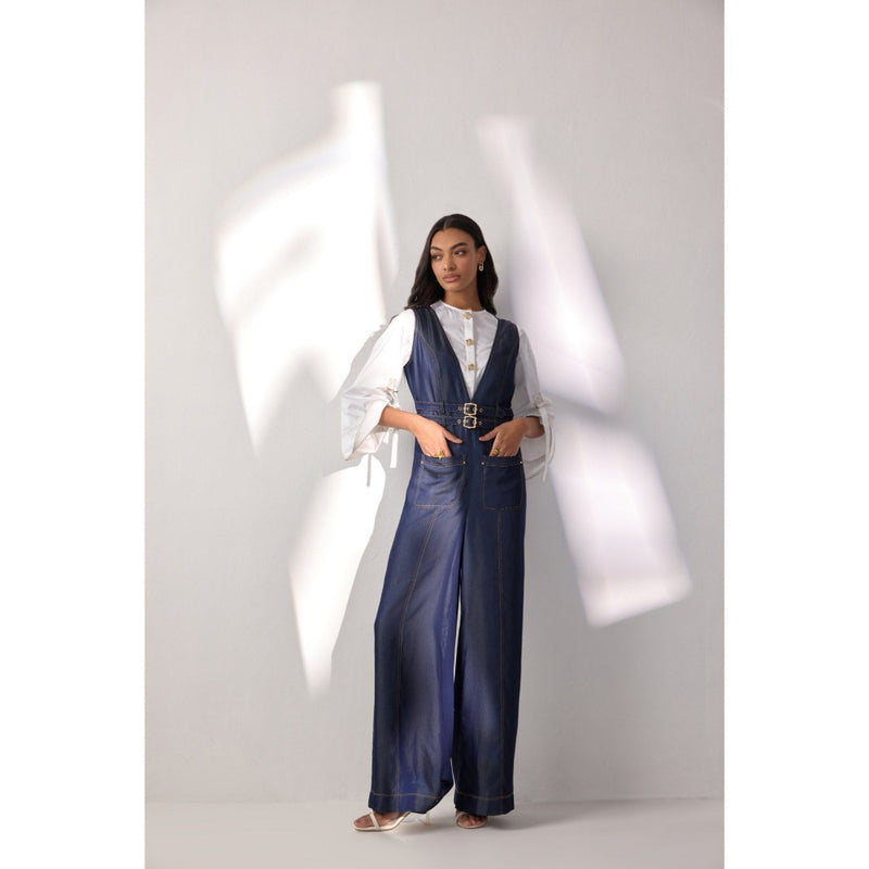 Description : Jumpsuit : Sleeveless Jumpsuit In A Relaxed Fit Top-Stitch Details All Over Double Belt Detail Functional Pockets At The Front Back Opening With Gold Metallic Zipper Gold Metal Buttons & Buckle Comes With A Separate Shirt Fabric : Butter Soft Denim-Effect Fabric Wash Care Instructions: Dry Clean Only Model's Height: 5'8'