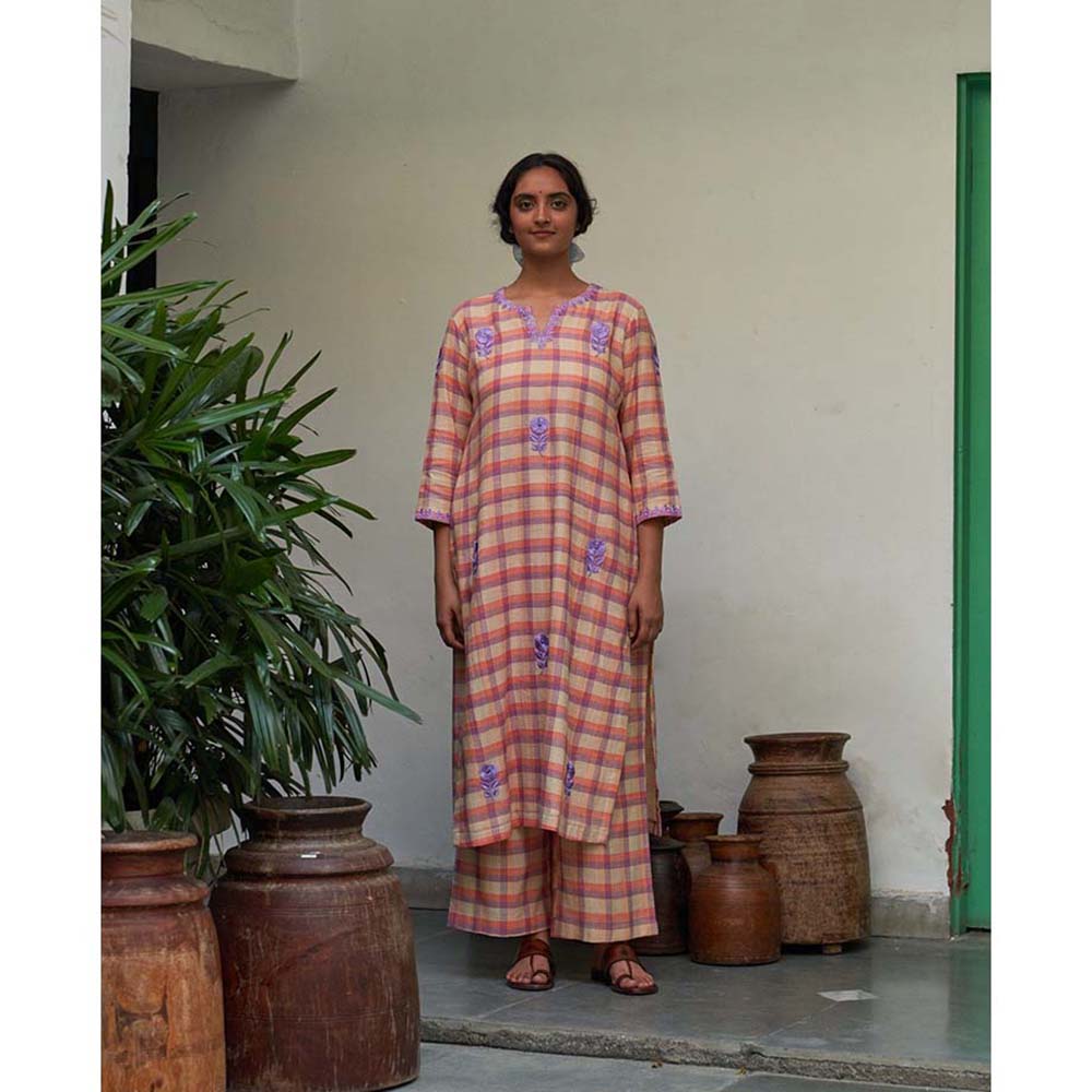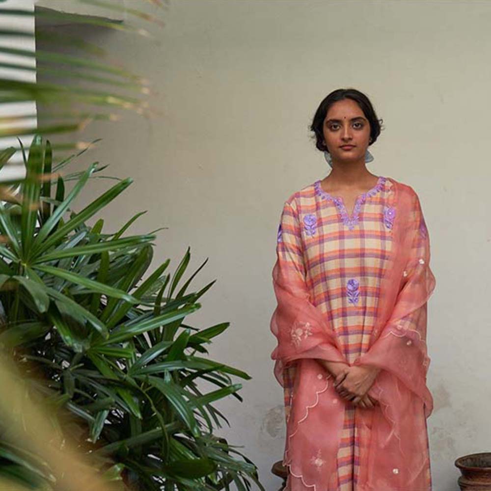 Label Earthen Gulabi Champai Phool Checked Embroidered Kurta Pant with Dupatta (Set of 3)