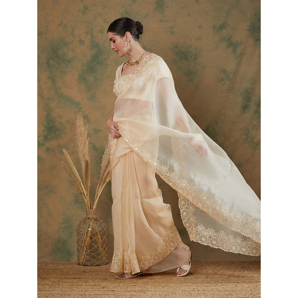 Description : A classic ivory saree made of luxurious silk organza fabric has monotone threadwork embroidery all over.It is paired with an ivory chanderi embroidered blouse.This saree is a timeless choice that you will treasure forever. FIT: True To SizeCOMPOSITION: Silk Organza , ChanderiCARE: Dry clean only.