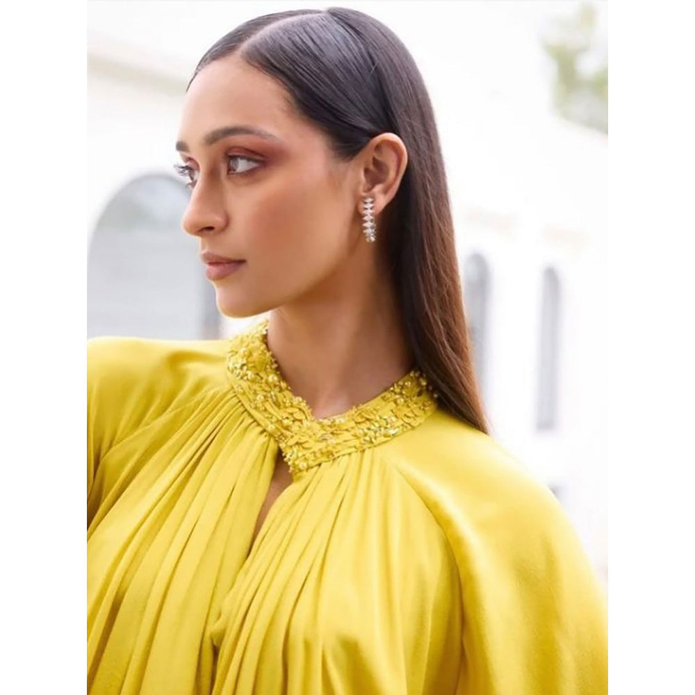 Description : Silk Crepe Draped Kurta Embellished with Crystal , Pearls and 3D Sequin Paired with Silk Crepe Pants