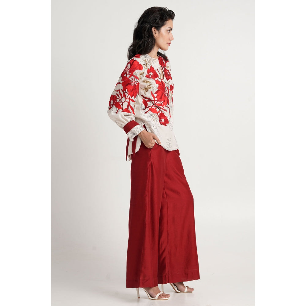 Description : Step into the world of effortless style with this red co-ord set from Madder Much. Made from high-quality fabric, the top features full sleeves, a keyhole neck and an embroidered pattern, finished with a mid-waisted pant. Style it with minimal jewellery and sandals to complete the ensemble.