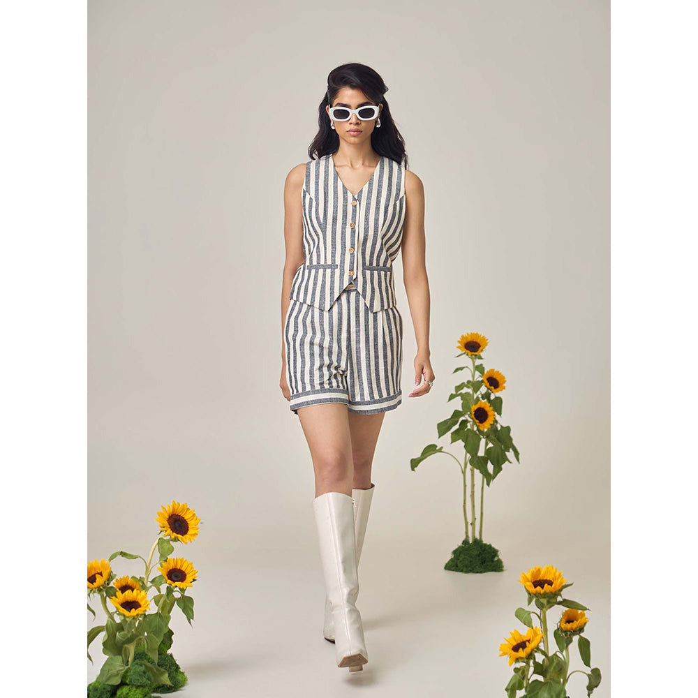 Description : The Sherry Co-Ord Set Is Where Tradition Meets Trend. Crafted In Luxurious Cotton Is A Sleeveless Striped Waistcoat And Matching Shorts, This Set Redefines Summer Tailoring With A Sense Of Lightness. The Clean Monochrome Palette Speaks To Timeless Style, While The Relaxed Fit Adds A Fresh, Youthful Spirit, Its The Kind Of Set That Works From Rooftop Brunches To Weekend Escapes.